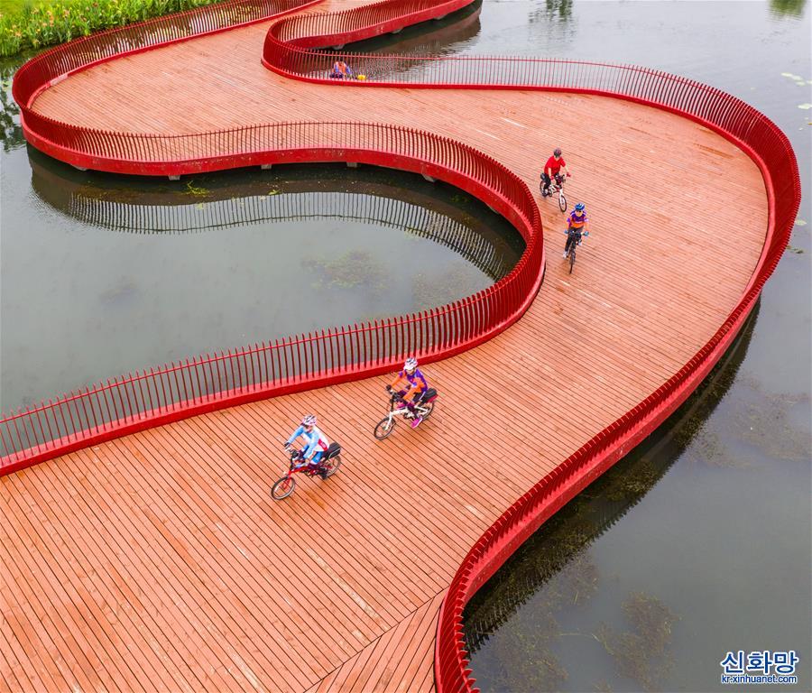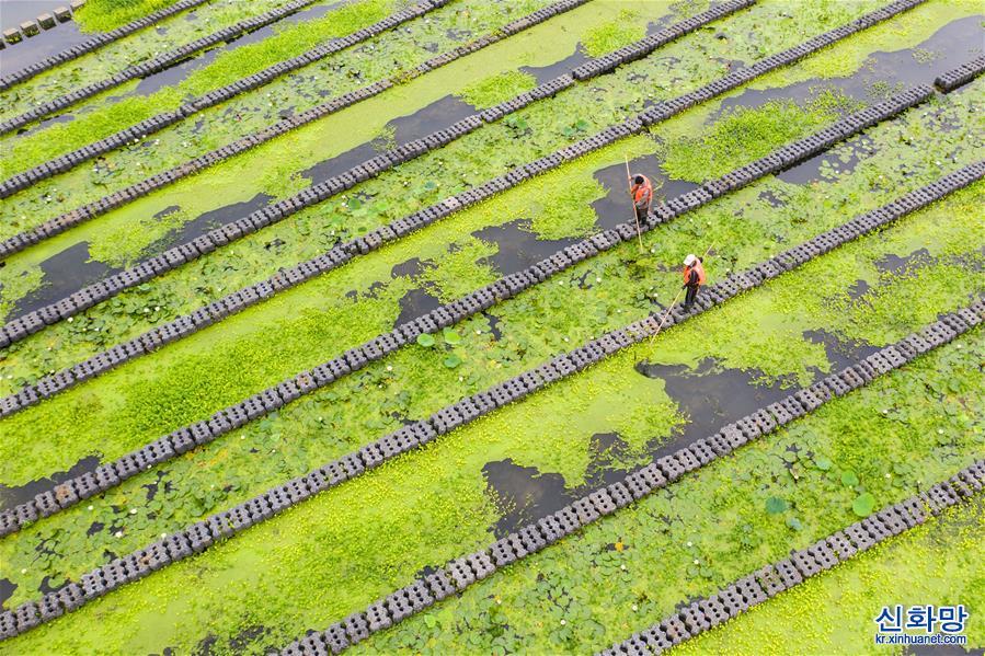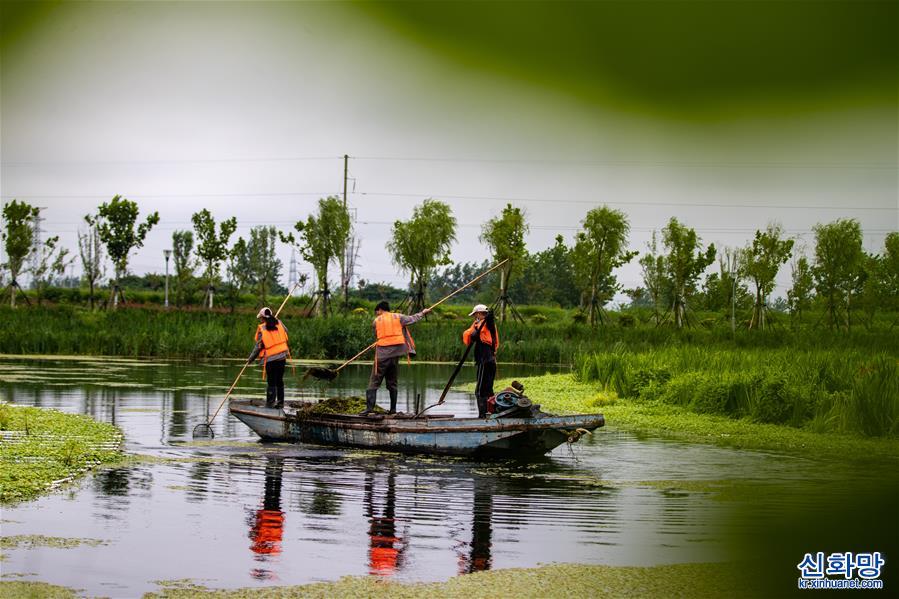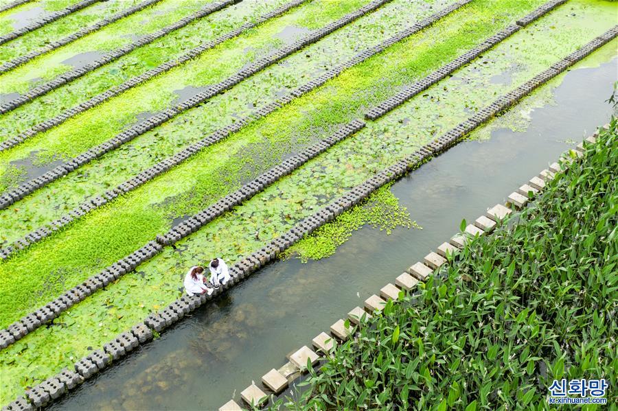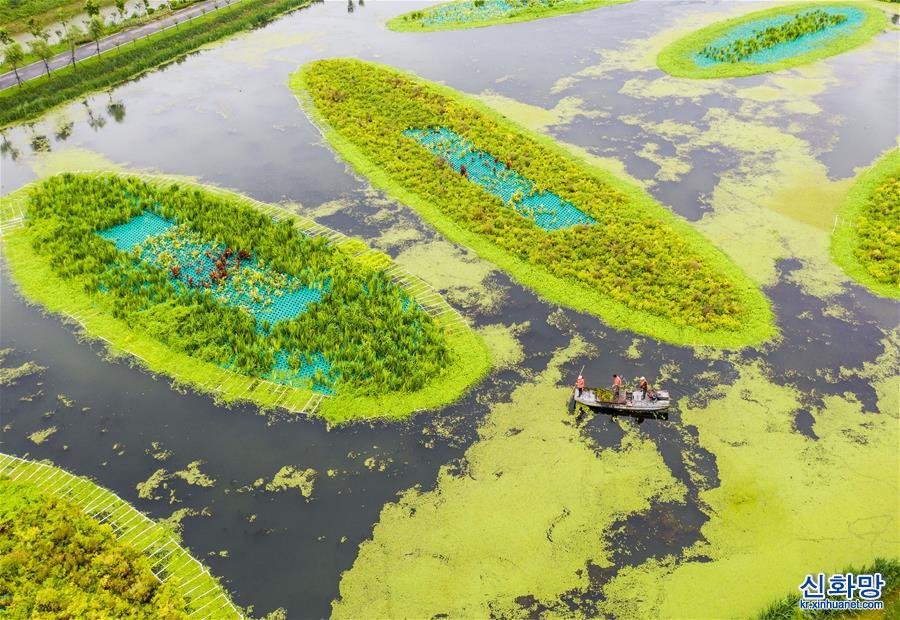 초록빛으로 완연한 써훙(泗洪)현 방류수 습지공원(드론 사진, 7월3일 촬영) 장쑤성 쑤첸시 써훙현은 북쪽 오수처리공장 주변 부지 280여묘에 방류수 습지공원을 조성했다. 공원에는 생태연못과 표류습지구, 심수식물구 등이 있다. 오수처리공장의 방류수는 이곳에서 다시 정화되어 지표수 수질 표준 Ⅳ류수에 도달한 후 생태 보급수로 강에 흘러 든다. 오수를 ‘삼키고’ 맑은 물을 ‘내뱉는’ 방류수 습지공원은 수로에 물을 보급할 뿐만 아니라 아름다운 환경으로 인근 주민들에게 휴식 장소와 건강 쉼터를 제공하고 있다. [촬영/쉬창량(許長亮)]