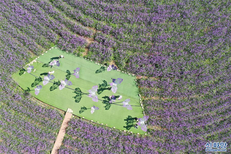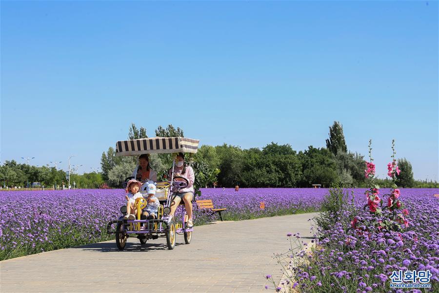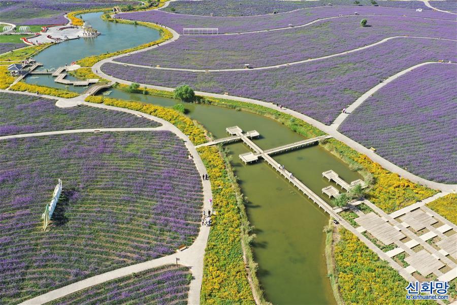 7월 12일 촬영한 간쑤(甘肅)성 진창(金昌)시 쯔진위안(紫金苑) 관광구(드론 촬영). 간쑤성 진창시는 중국 최대의 니켈·코발트 생산기지로서 ‘니켈의 도시’라고도 불린다. 최근 몇 년에 들어, 화원도시 건설에 박차를 가한 진창시는 주야 기온차가 심하고 일조가 충분한 현지 자연조건을 이용해 꽃을 도입함으로써 고비사막에 자리한 이 공업도시를 꽃바다에 둘러쌓인 전원식 꽃의 도시로 변신시켰다. [촬영/신화사 기자 두저위(杜哲宇)]