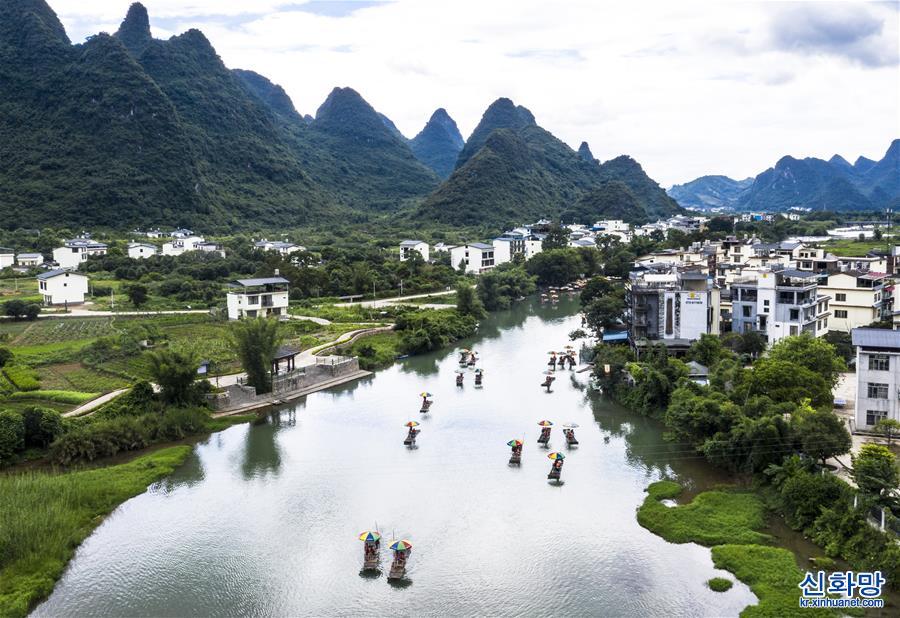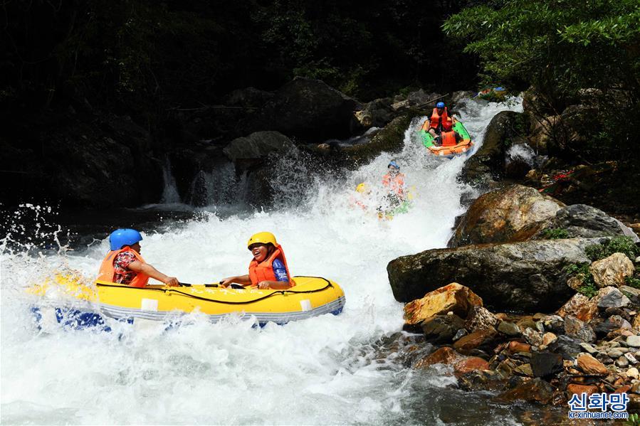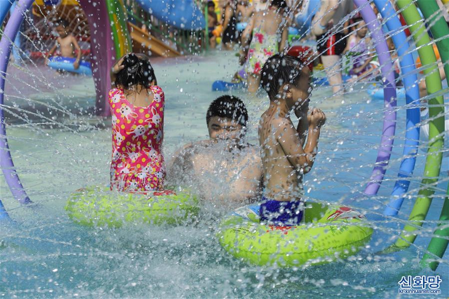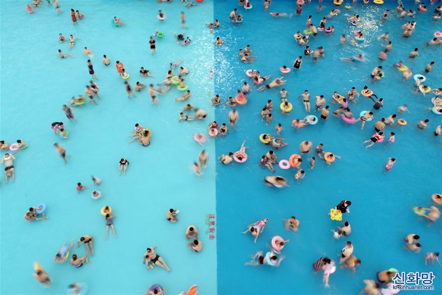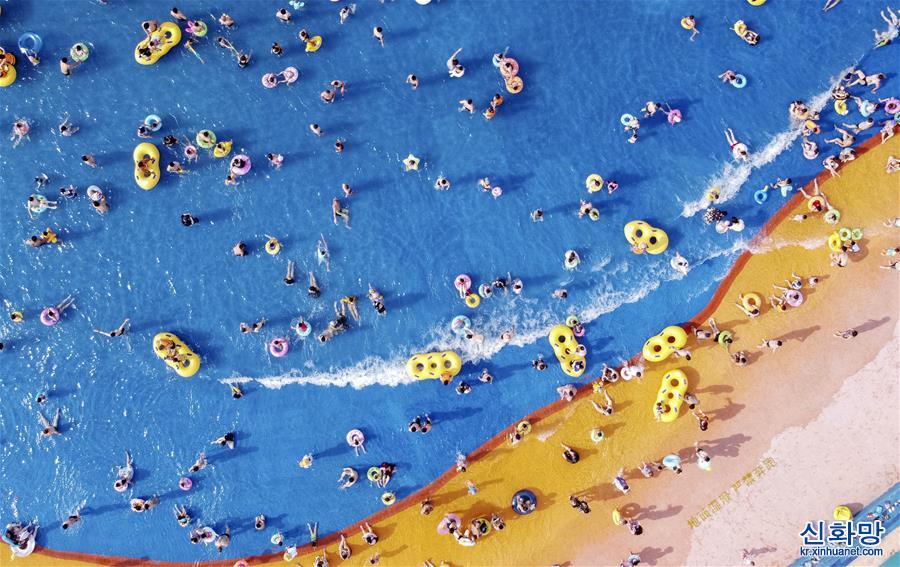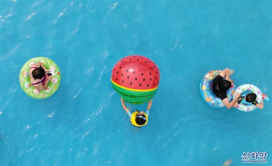8월 2일, 유람객이 장쑤(江蘇)성 타이저우(泰州)시 추쉐후(秋雪湖) 환러스제(歡樂世界) 워터파크에서 물놀이 하고 있다(드론 촬영). [촬영/ 구지훙(顧繼紅)]