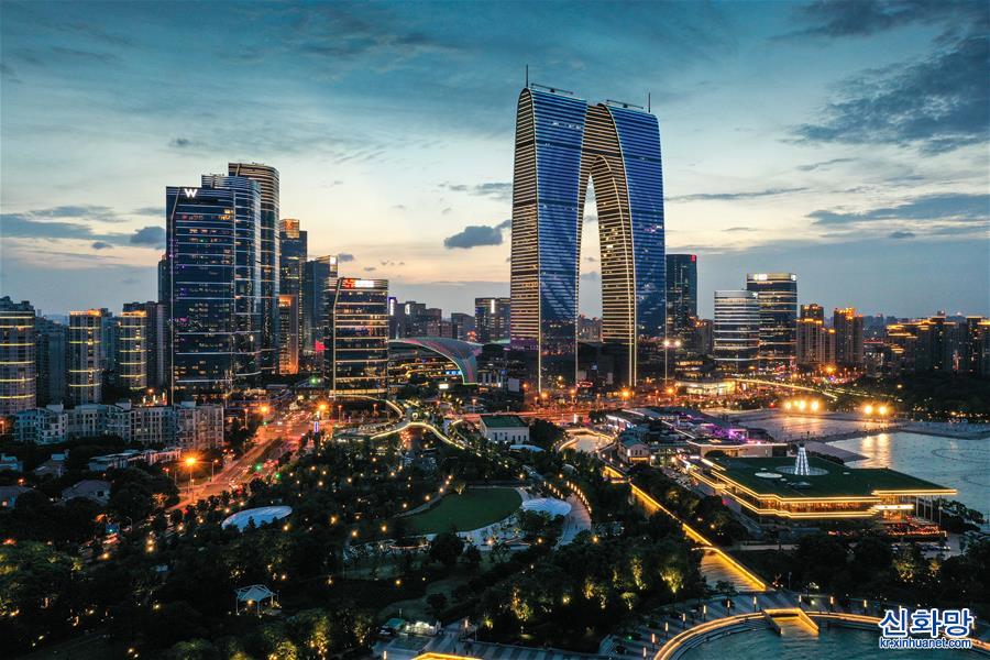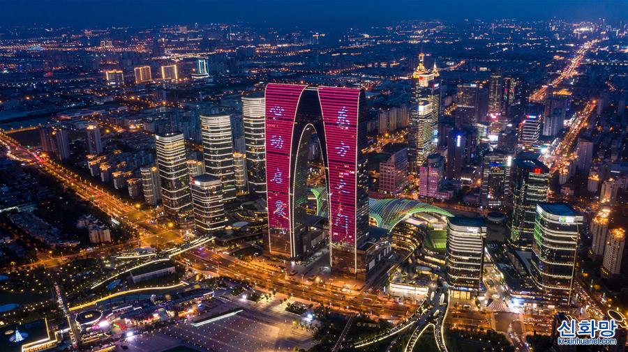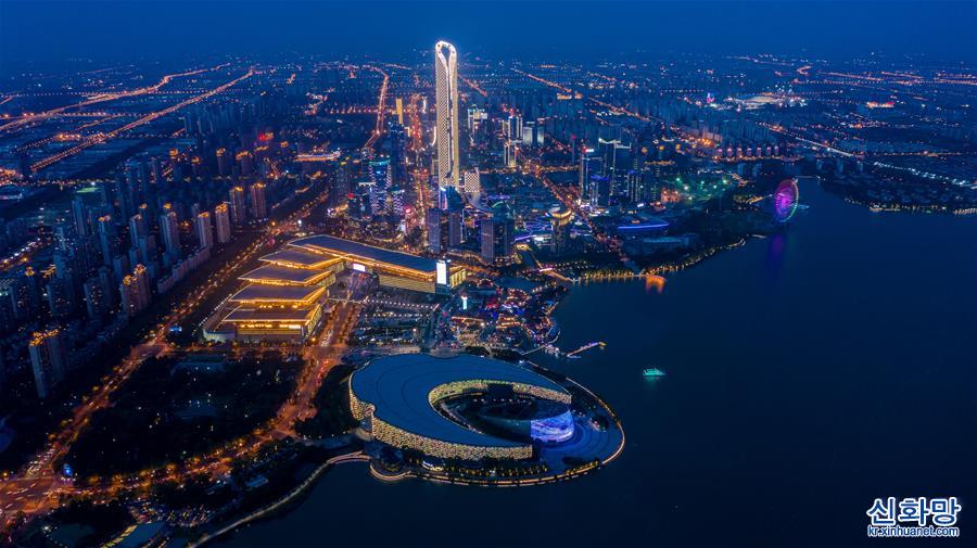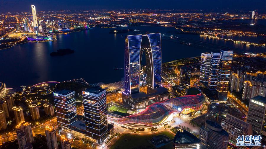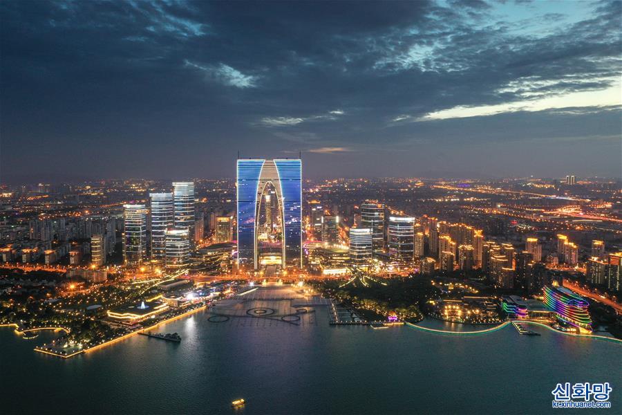 7월 31일 촬영한 쑤저우(蘇州) 산업단지 내 진지후(金雞湖) 호숫가 야경(드론 촬영). 여름 밤 쑤저우 진지후 호숫가 경치가 매력적이고 눈부신 도시 경관조명이 어둠이 내린 쑤저우를 더없이 아름답게 꾸며 주었다. [촬영/ 신화사 기자 리보(李博)]