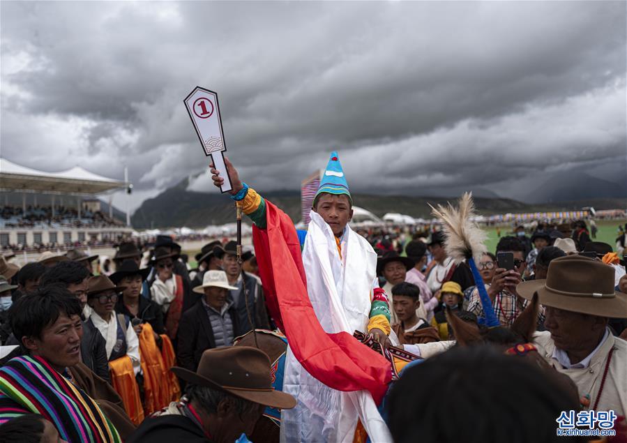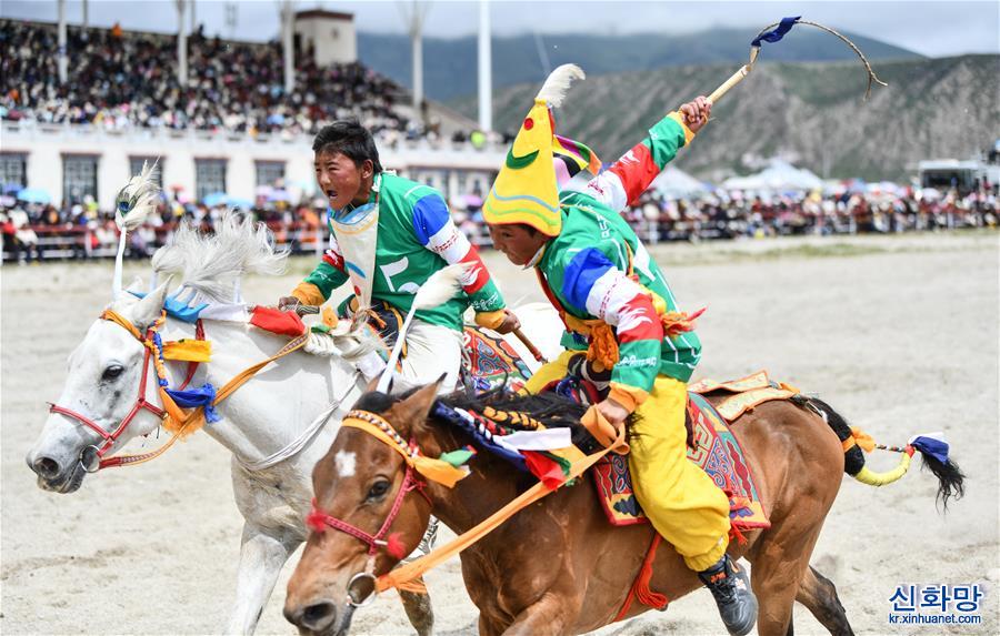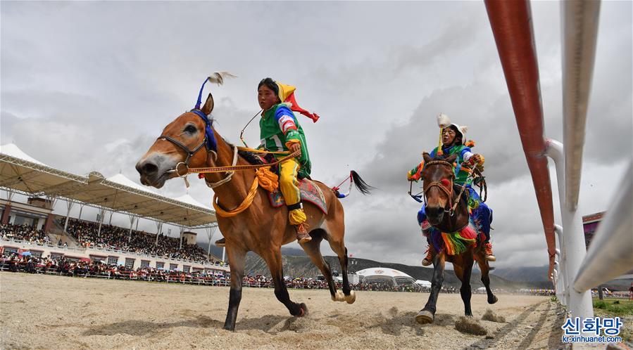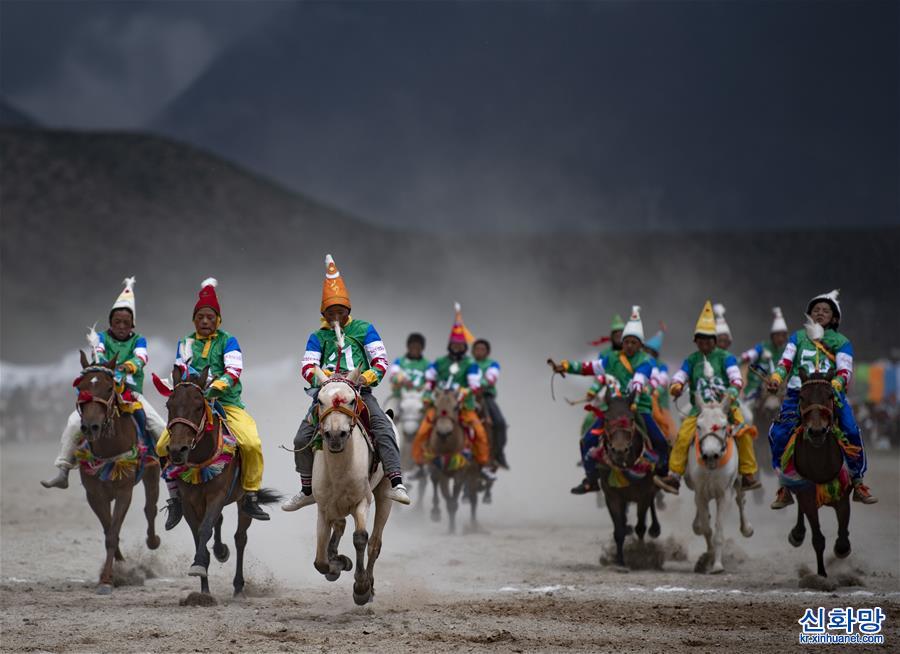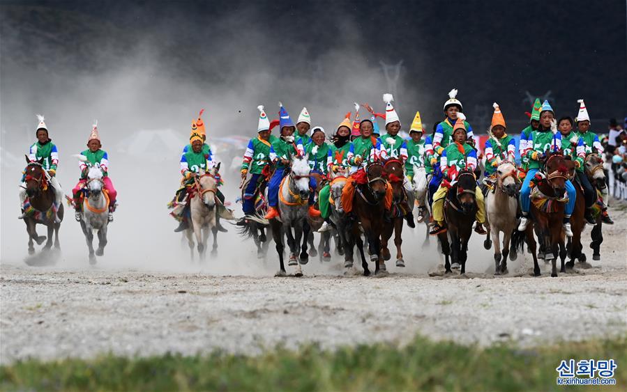 8월10일, 기수가 당슝(當雄)현 경마장에서 말을 타고 달리고 있다. ‘당지런(當吉仁)’ 경마 축제 경기 중 하나인 5km 장거리 경마 경기가 시짱 라싸시 당슝현 경마장에서 열렸다. 매년 개최되는 ‘당지런’ 경마 축제가 8월8일 평균 해발 4300m의 당슝현에서 개막했다. 당슝 초원에서 온 목축민들이 자신의 말을 타고 채찍을 휘두르며 질주해 자웅을 겨뤘다.
