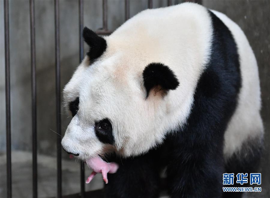 산시(陜西) 시안(西安)의 친링(秦嶺)자이언트판다번식연구센터에서 친친(秦秦)자이언트판다가 막 태어난 자이어트판다 새끼와 함께 있다.