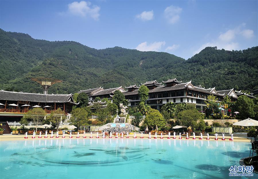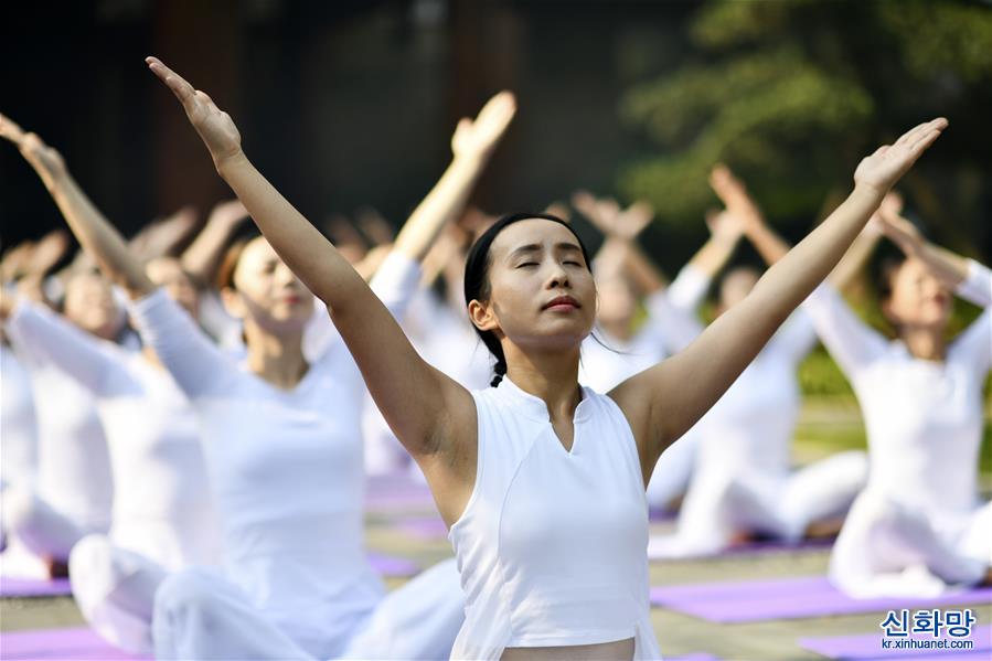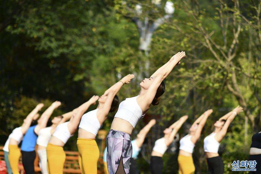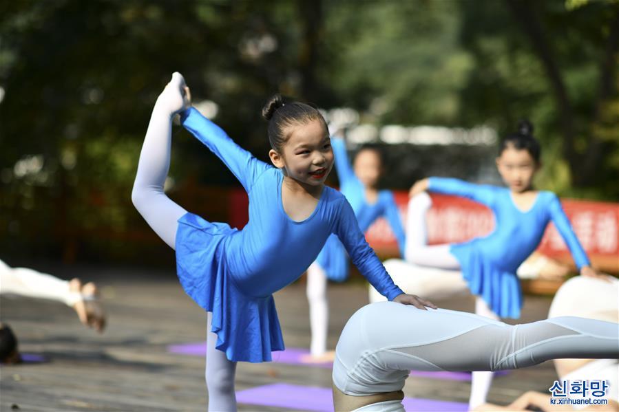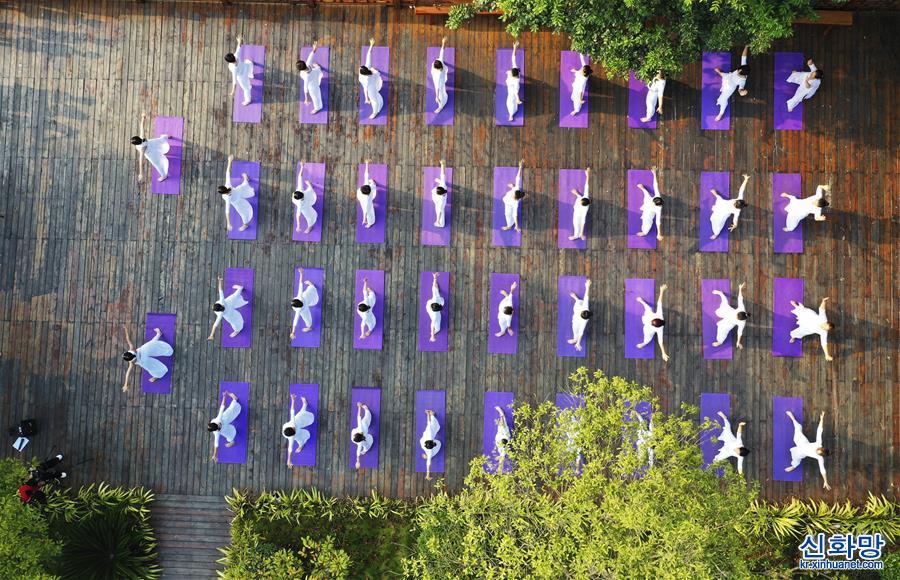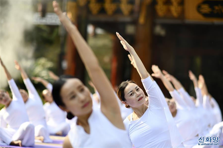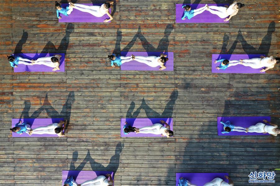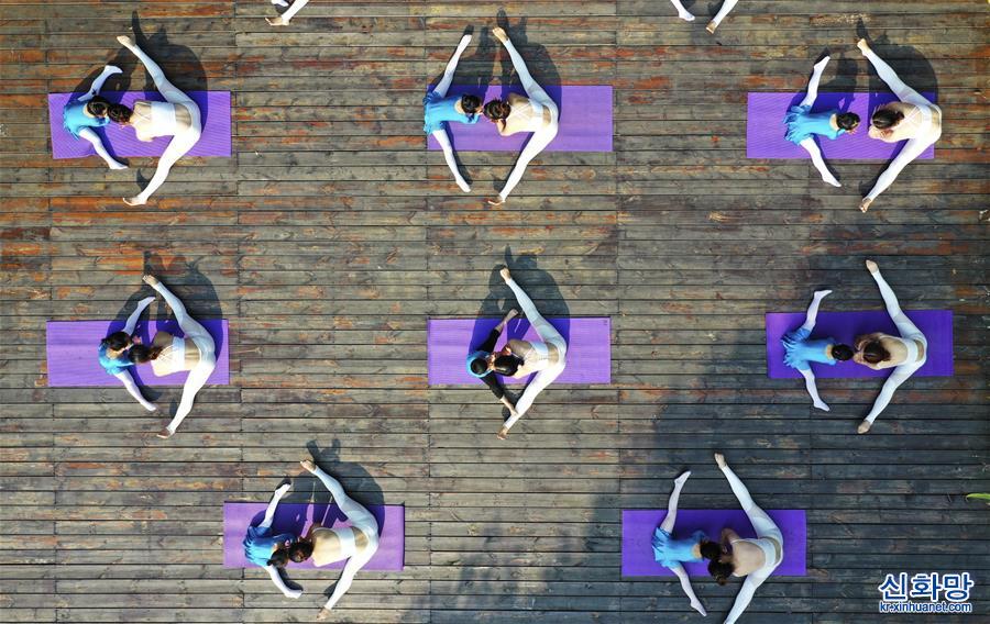 8월30일, 요가 애호가들이 요가를 시연하고 있다.(드론 사진) 8월30일, 구이저우성 첸둥난 먀오족둥족자치주 젠허(劍河)현의 요가 애호가들이 젠허 온천 풍경구에서 요가 시연 행사에 참가했다. [촬영/신화사 기자 양원빈(楊文斌)]