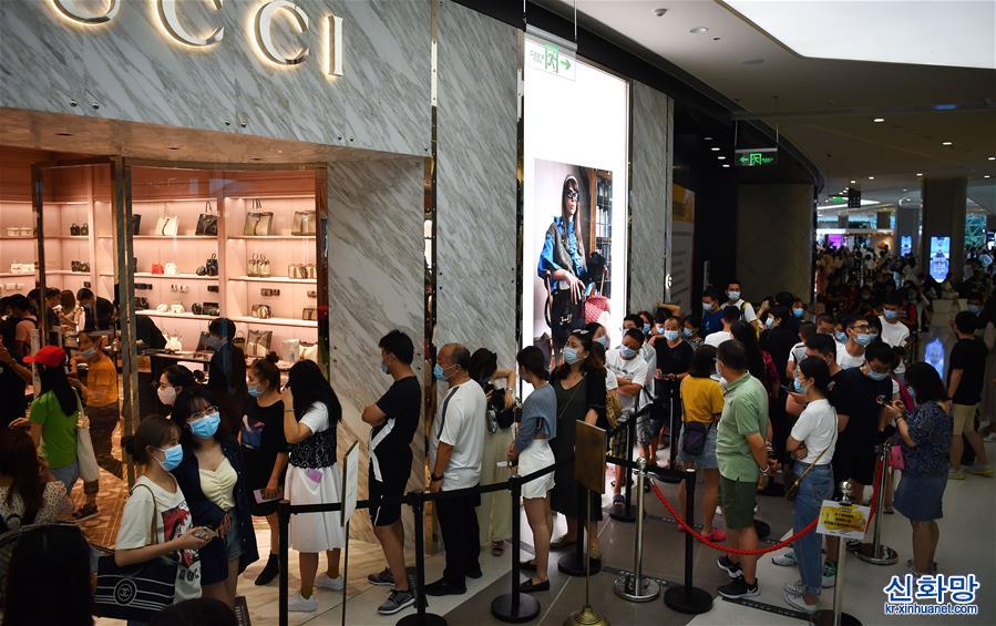 10월5일 관광객이 싼야 국제면세점에서 줄을 서서 쇼핑하고 있다.
