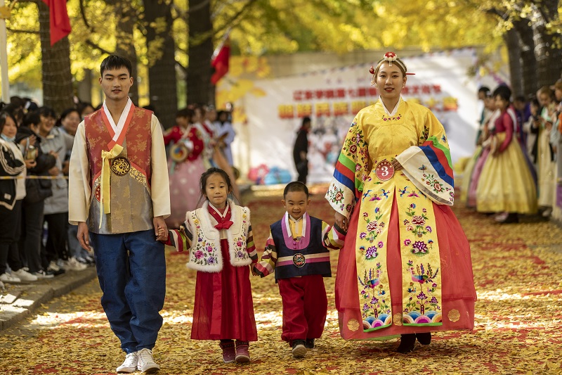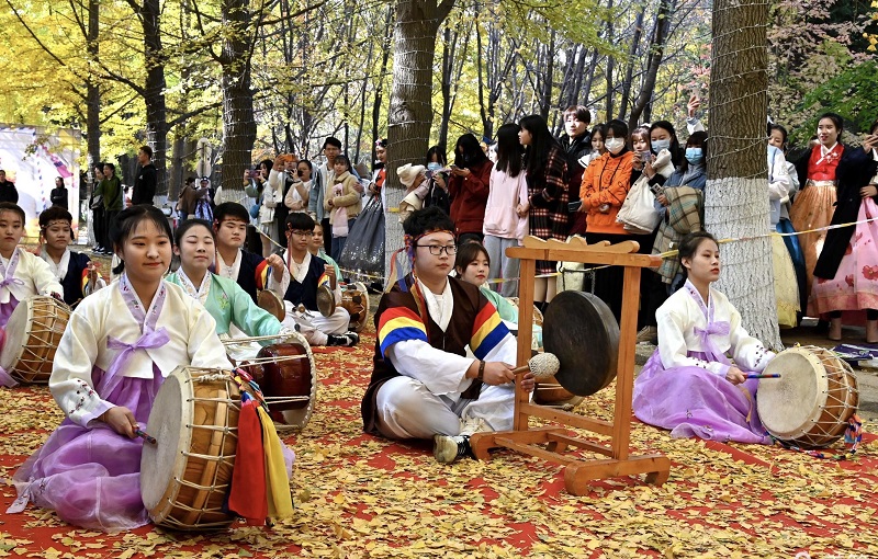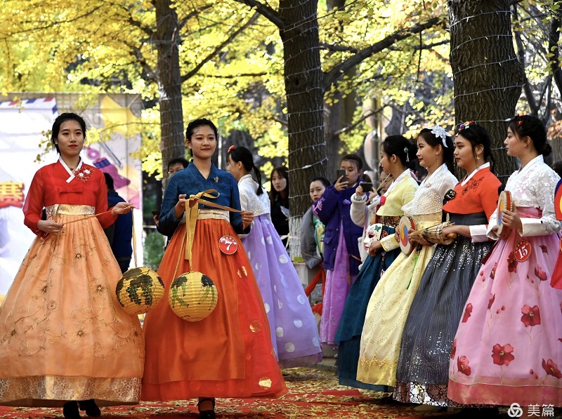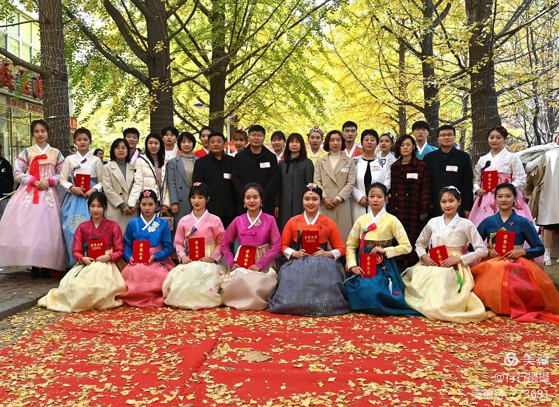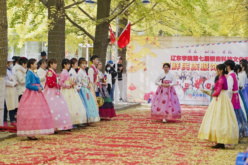 10월 25일, 료동대학교 학생들이 황금빛으로 물든 교정의 은행나무도로에서 조선족 전통의상의 미를 선보였다.