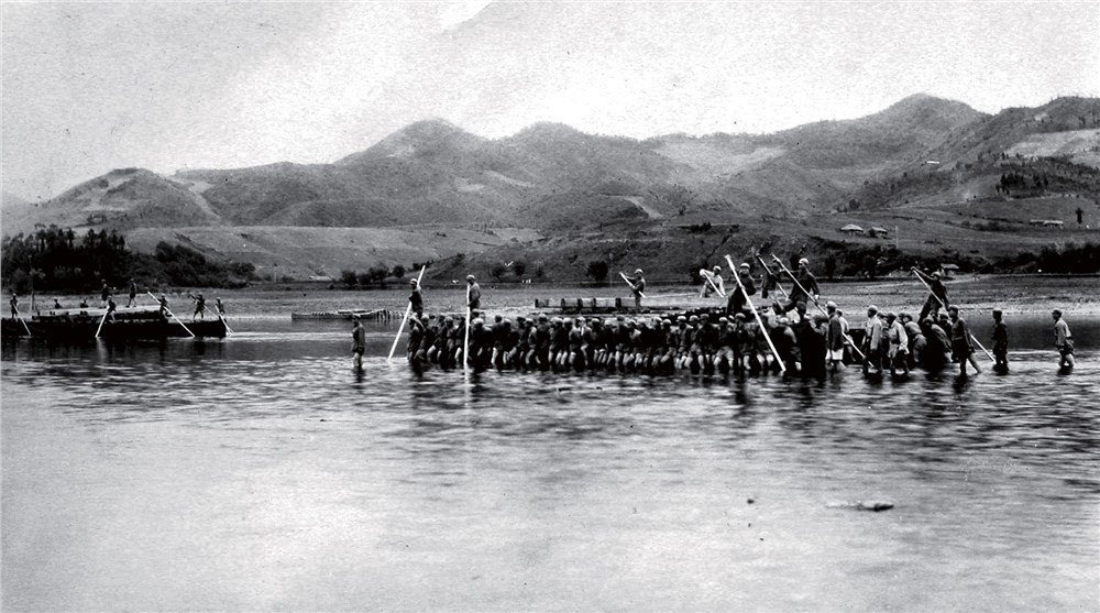 "힘차고 씩씩하게 압록강을 건느자”. 1950 년 10 월 19 일 줄국인민지원군은 안동,장전하구와 집안을 통해 압록강을 건너 항미원조전쟁에 적극 참전 하였다 . 이로서 단동은 조국 후방을 수호하는 최전방도시가되였다.