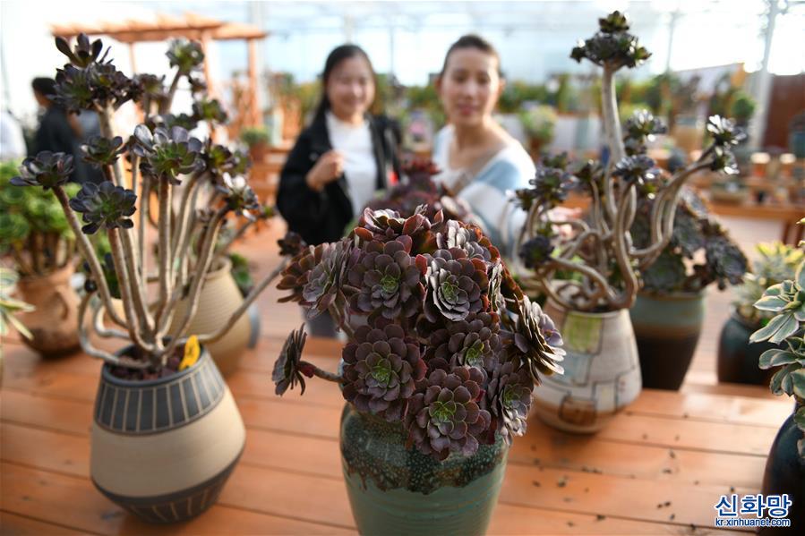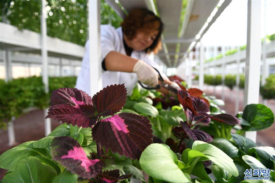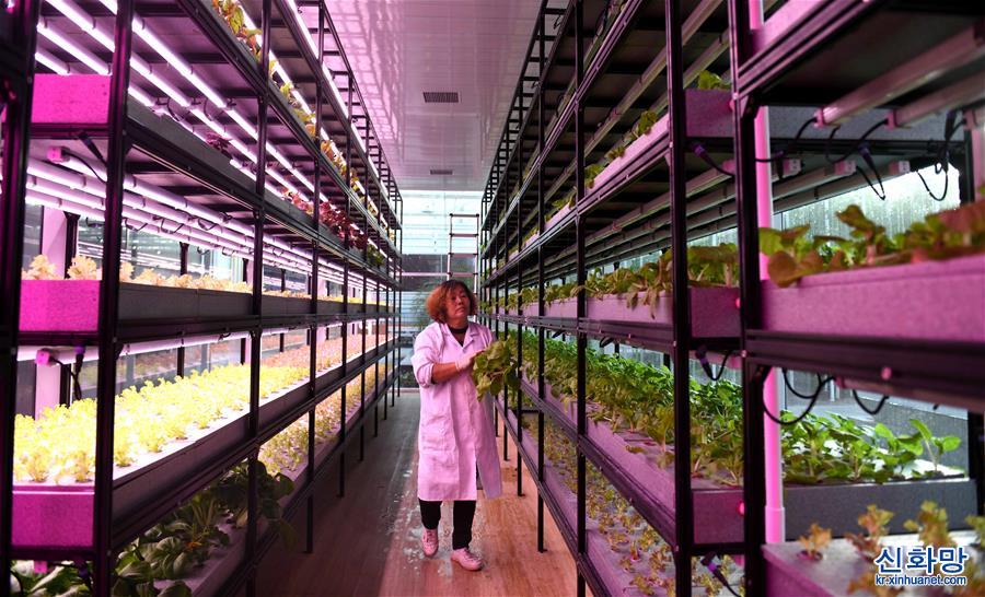 10월13일, 허베이성 스자좡(石家莊)시 정딩(正定)현 타위안좡(塔元莊)촌 ‘스마트팜’ 온실 안에서 일군이 야채를 관리하고 있다. 허베이성 스자좡시 정딩현은 현대 농업산업발전에 박차를 가하고 있다. 얼마 전 녹색 생태 농업, 레저관광농업, 첨단현대농업 등이 집결된 ‘스마트팜’이 완공됐다. 부지 면적
