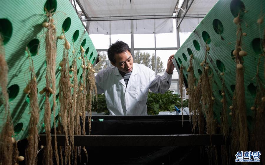 쓰촨농업대학에서 박사과정을 밟고 있는 연구생 옌펑쥔(嚴奉君)이 부퉈(布拖) 감자 과학기술 단지에서 분무 재배한 감자의 원품종을 살펴보고 있다. (10월18일 촬영)
