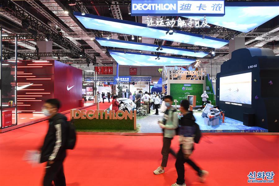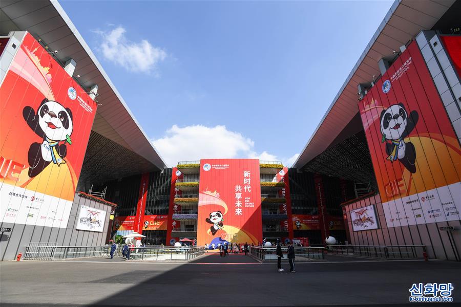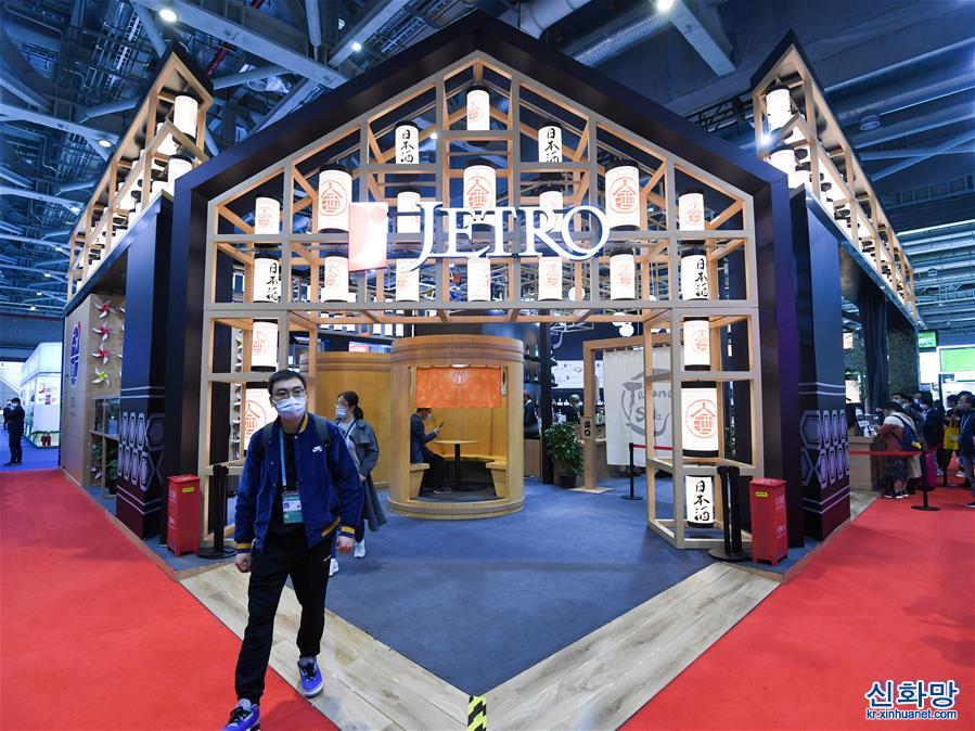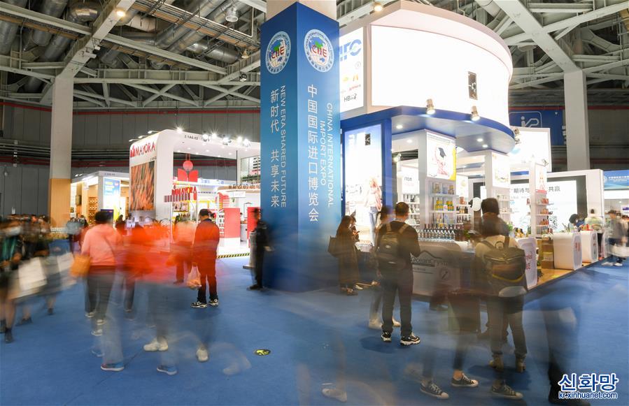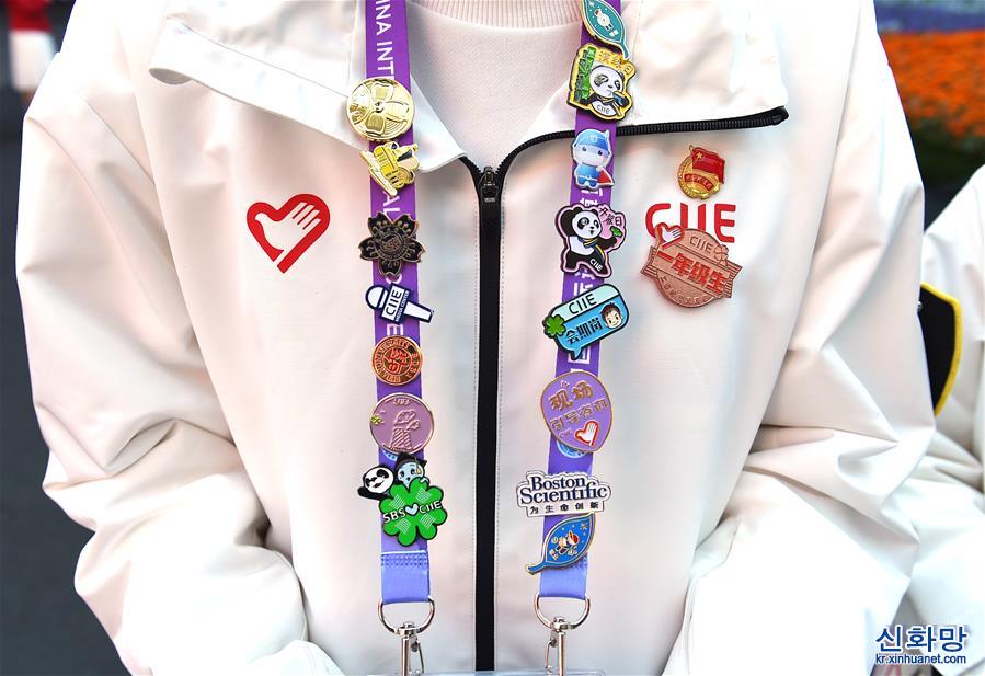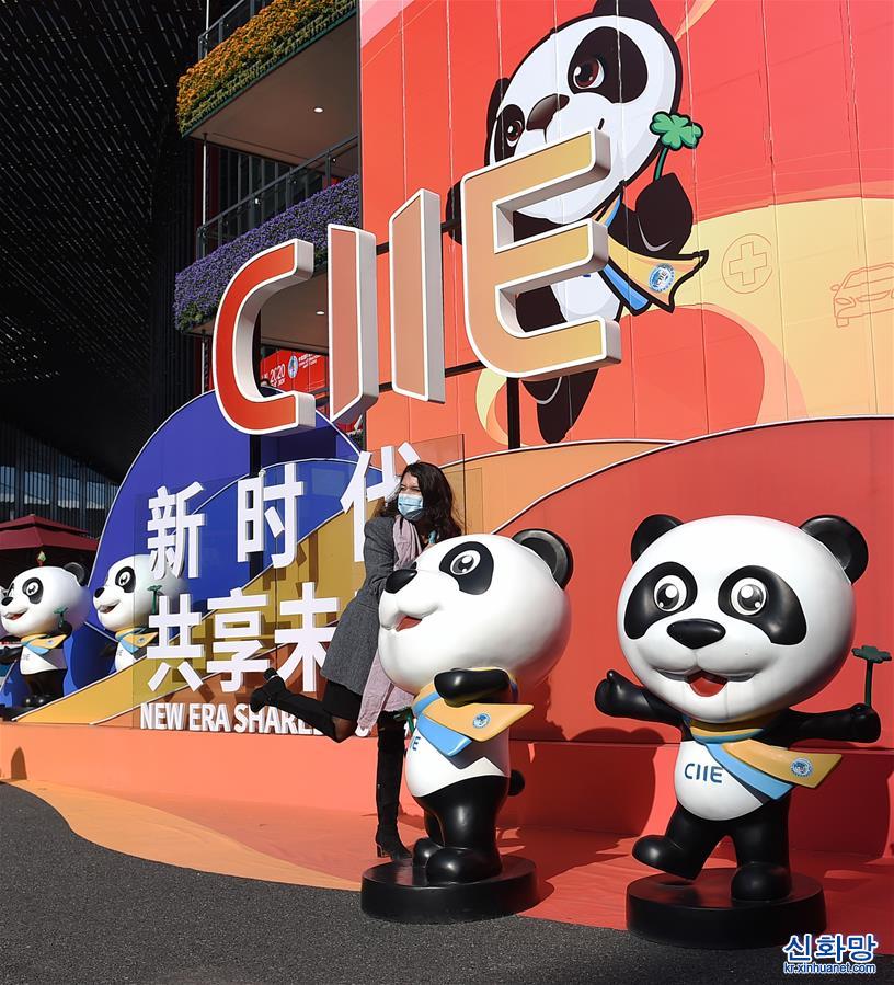 11월10일, 외국 박람회 참가자 한 명이 수입박람회 테마 장식 앞에서 기념사진을 찍고 있다. 제3회 중국국제수입박람회(CIIE)가 10일 상하이에서 막을 내렸다. [촬영/신화사 기자 자오딩저(趙丁喆)]