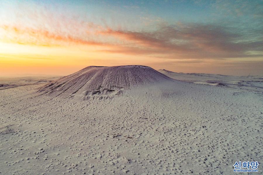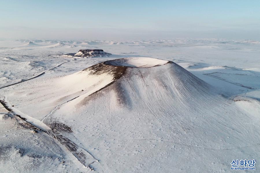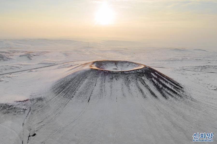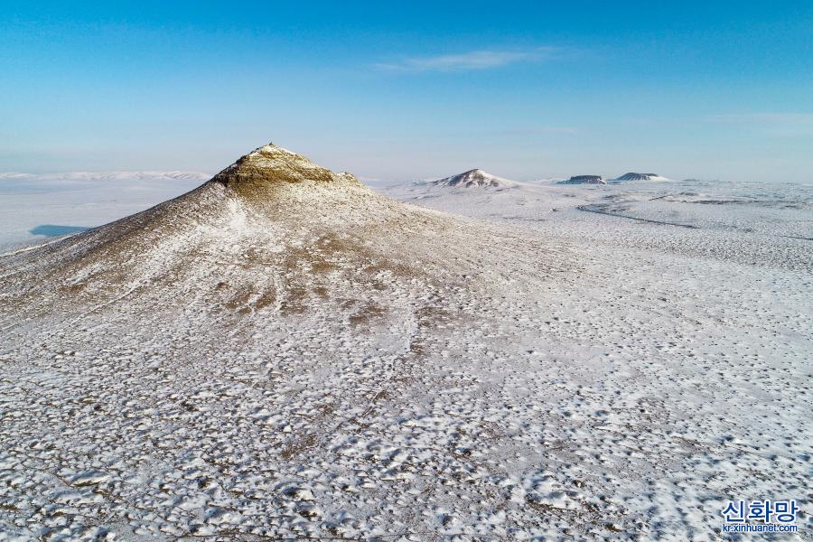 챠하르(察哈爾) 화산 경치(드론 사진, 11월28일 촬영). 내몽골자치구 중부의 울란챠브시 챠하르우익후기(바얀챠간)에서 차하르우익중기(호보르) 일대에 위치해 있는 차하르 화산군은 30여개의 화산이 마치 구슬을 꿴 듯한 형태로 광활한 초원 위에 분포해 있다. 초겨울이 되면서 눈으로 뒤덮인 챠하르 화산군이 설원과 어우러져 빼어난 설경을 연출하고 있다. [촬영/왕정(王正)]