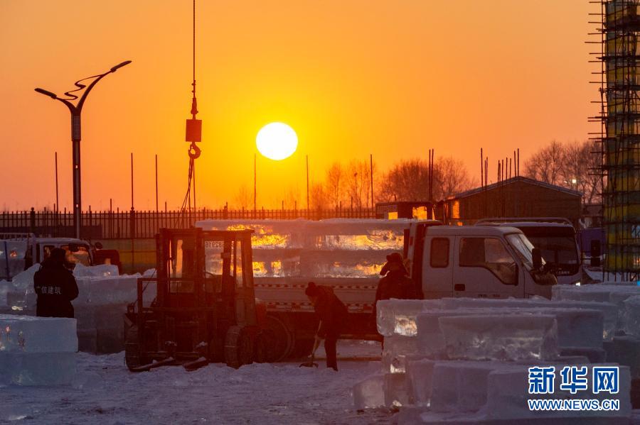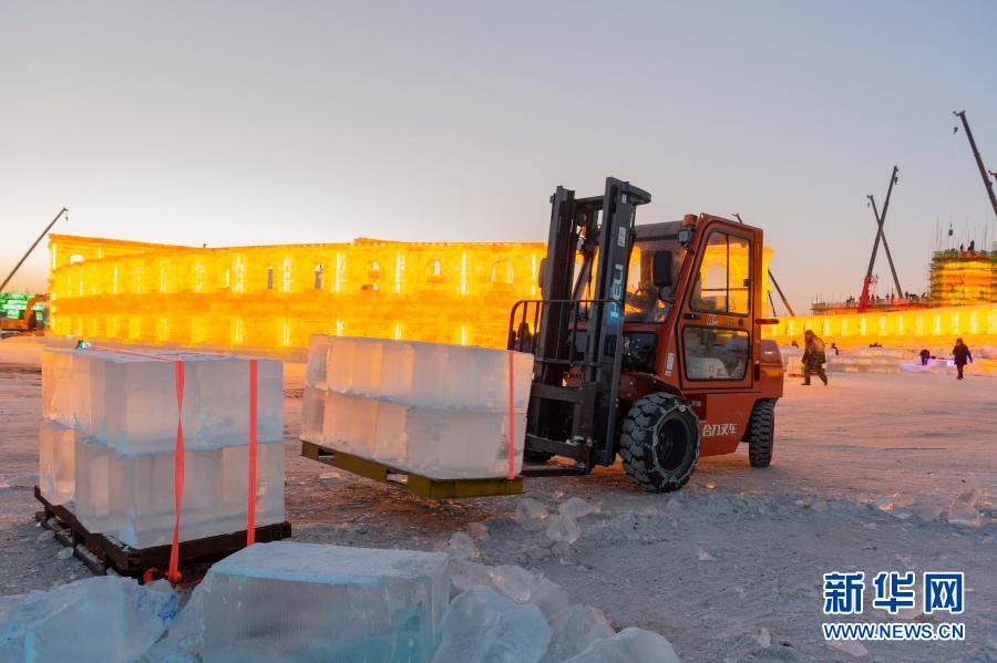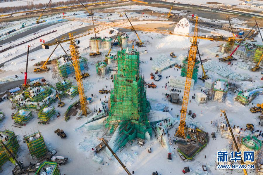 이번 빙설대세계는 얼음건축경관을 통해 부동한 지역의 인민풍정과 할빈의 도시특색을 전시하여 관광객들을 위해 몽환적이고 즐거운 빙설락원을 구축한다. 현재 빙설대세계원구는 다그쳐 시공하고 있는데 12월 중하순에 개원할 예정이다(신화사 기자 사검비 촬영).