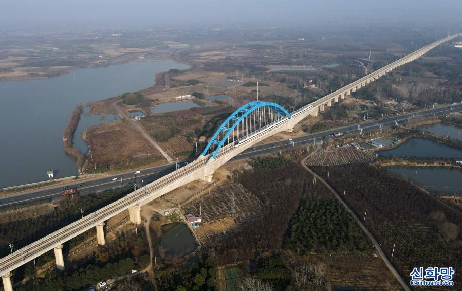 고속열차가 안후이 페이시(肥西) 화강(花崗) 대교를 지나가고 있다.(12월22일 촬영, 드론 사진)