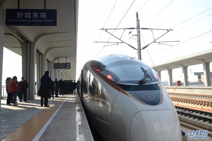 베이징-홍콩 고속철도 허페이(合肥)-안칭(安慶) 구간이 22일 운영을 시작했다. 베이징-홍콩 고속철도 허페이-안칭 구간은 8횡8종 고속철도망 베이징-홍콩(타이베이) 통로의 중요한 구성부분으로 북단은 허페이 허브를 통해 상추(商丘)-허페이-항저우(杭州) 고속철도, 허페이-난징(南京) 고속철도, 허페이-푸저우(福州) 고속철도 등에 연결되고, 남단은 안칭과 닝안(寧安) 고속철도에서 건설 중인 베이징-홍콩 고속철도 안칭-주장(九江) 구간에 연결된다. 노선 총연장은 176km, 설계시속은 350km이며, 허페이 남역, 페이시(肥西), 수청(舒城) 동역, 루장(廬江) 서역, 퉁청(桐城) 동역, 퉁청 남역, 안칭 등 7개의 역이 설치돼 있다. [촬영/신화사 기자 류쥔시(劉軍喜)]