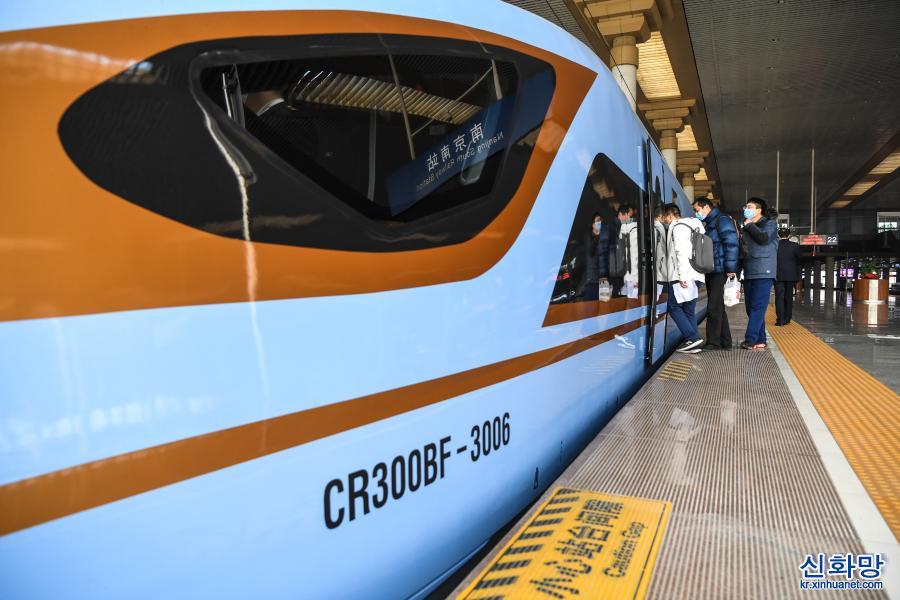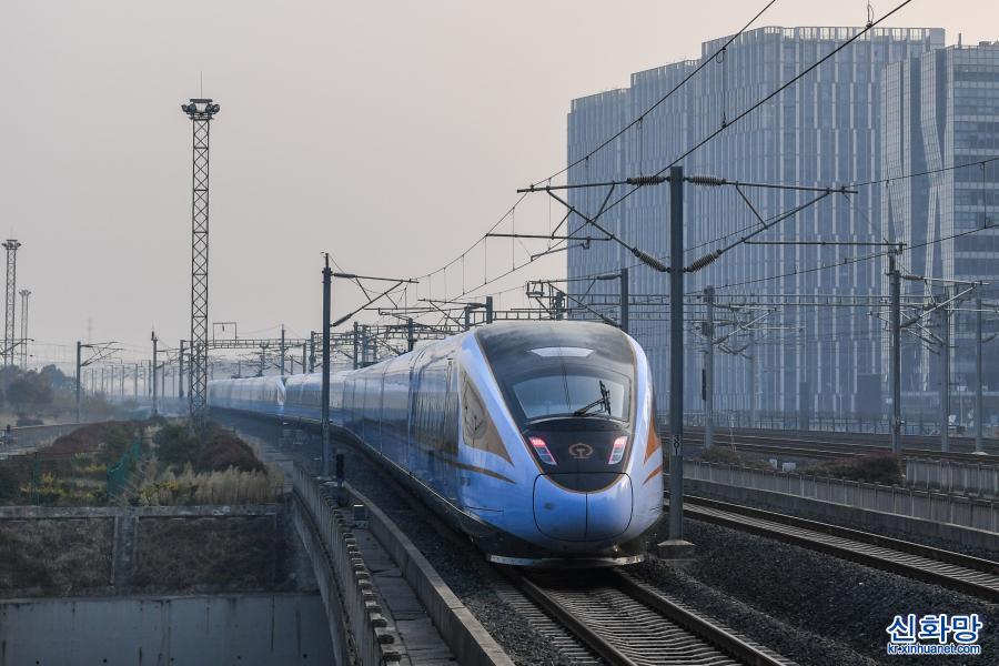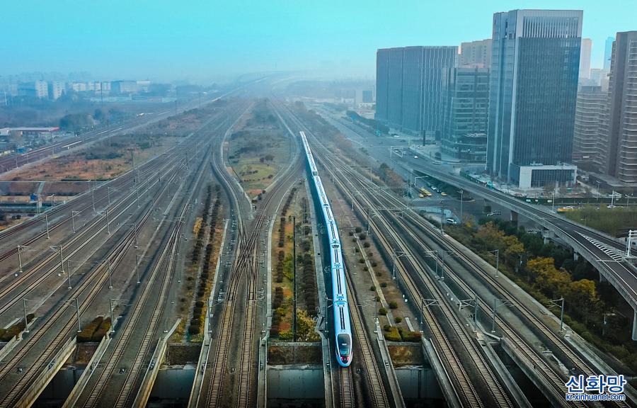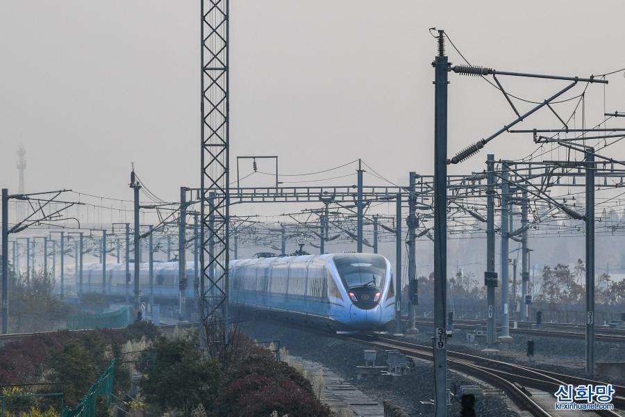 12월 24일, CR300BF형 ‘푸싱호(復興號)’ 탄환열차가 운영을 맡은 C3887편 열차가 난징(南京) 남역에서 출발하고 있다. [촬영/ 신화사 기자 리보(李博)] 24일 오전,