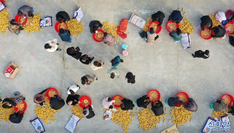 12월27일, 야오거우(瑤溝)향 농민들이 옥수수 껍질 벗기기 대회에 참여하고 있다.(드론 사진)