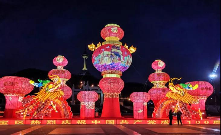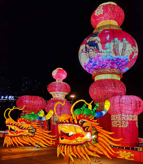 “룡등원보(龙腾元宝)” 채색등은 길이 25 메터, 너비 8 메터, 높이 12 메터로서 한조의 큰 홍등롱으로 구성된 강대한 등롱대렬이다. “이룡희주(二龙戏珠)’의 조형을 모방하였는데 매우 휘황찬란한 감을 준다. 편역:추윤