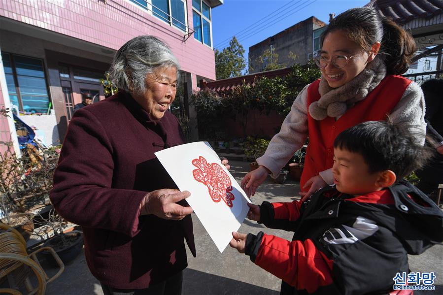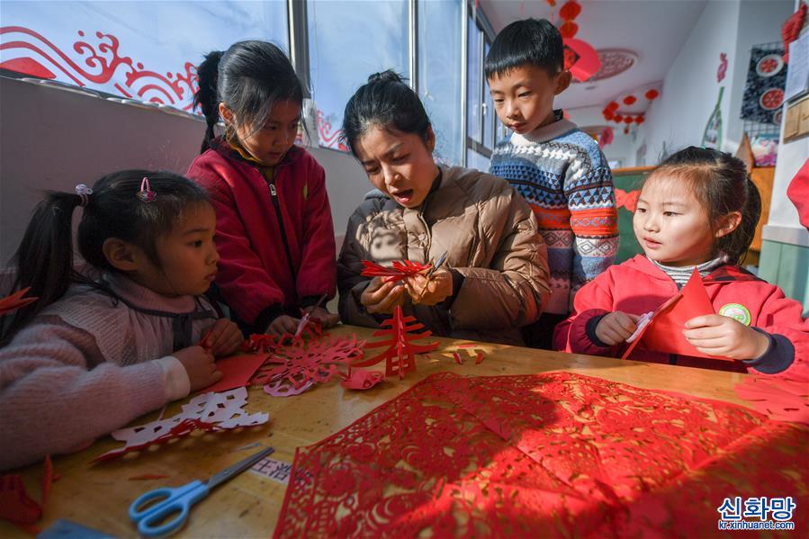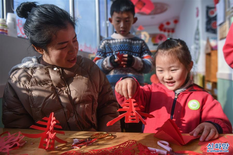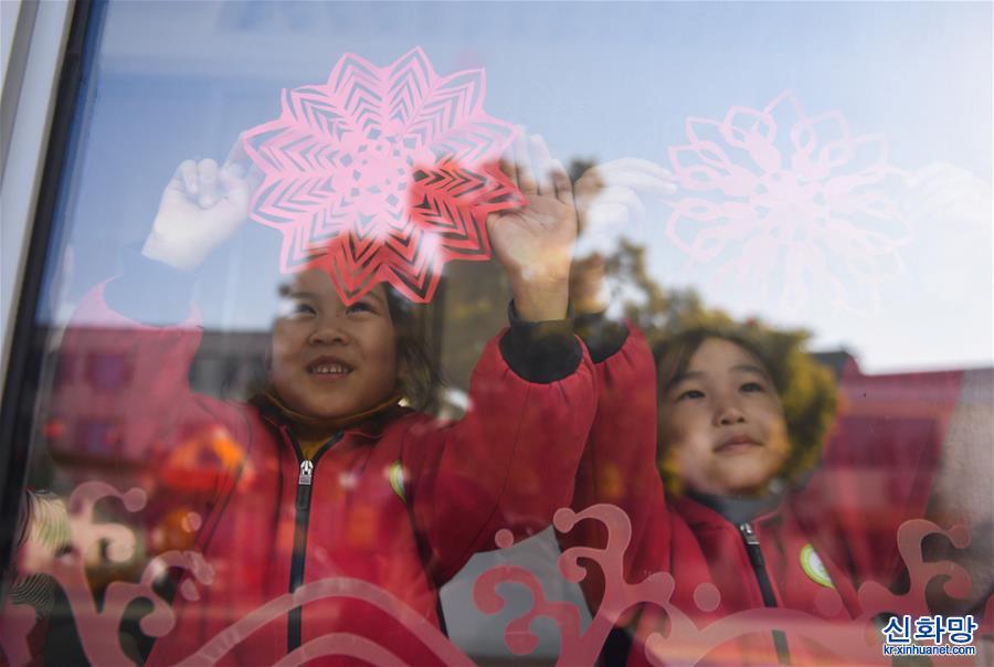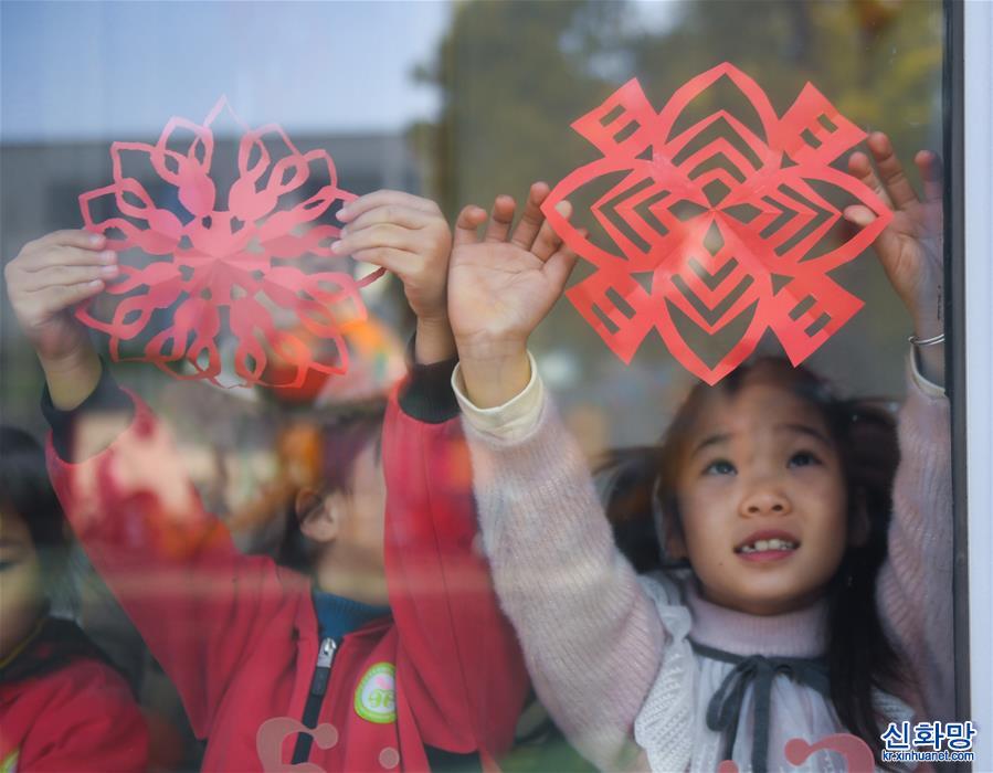 1월20일, 창싱(長興)현 리자샹(李家巷)진 중심유치원의 어린이들이 종이를 자르고 오려 만든 작품을 창문에 붙이고 있다. 저장성 후저우시 창싱(長興)현 리자샹(李家巷)진 중심유치원의 교사와 어린이들이 함께 종이를 자르고 오려 만든 작품을 창문에 붙이고, 주변 농민들에게 나눠주면서 새해 건강과 행복을 기원했다. [촬영/신화사 기자 쉬위(徐昱)]