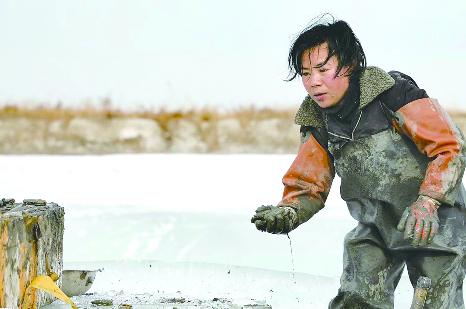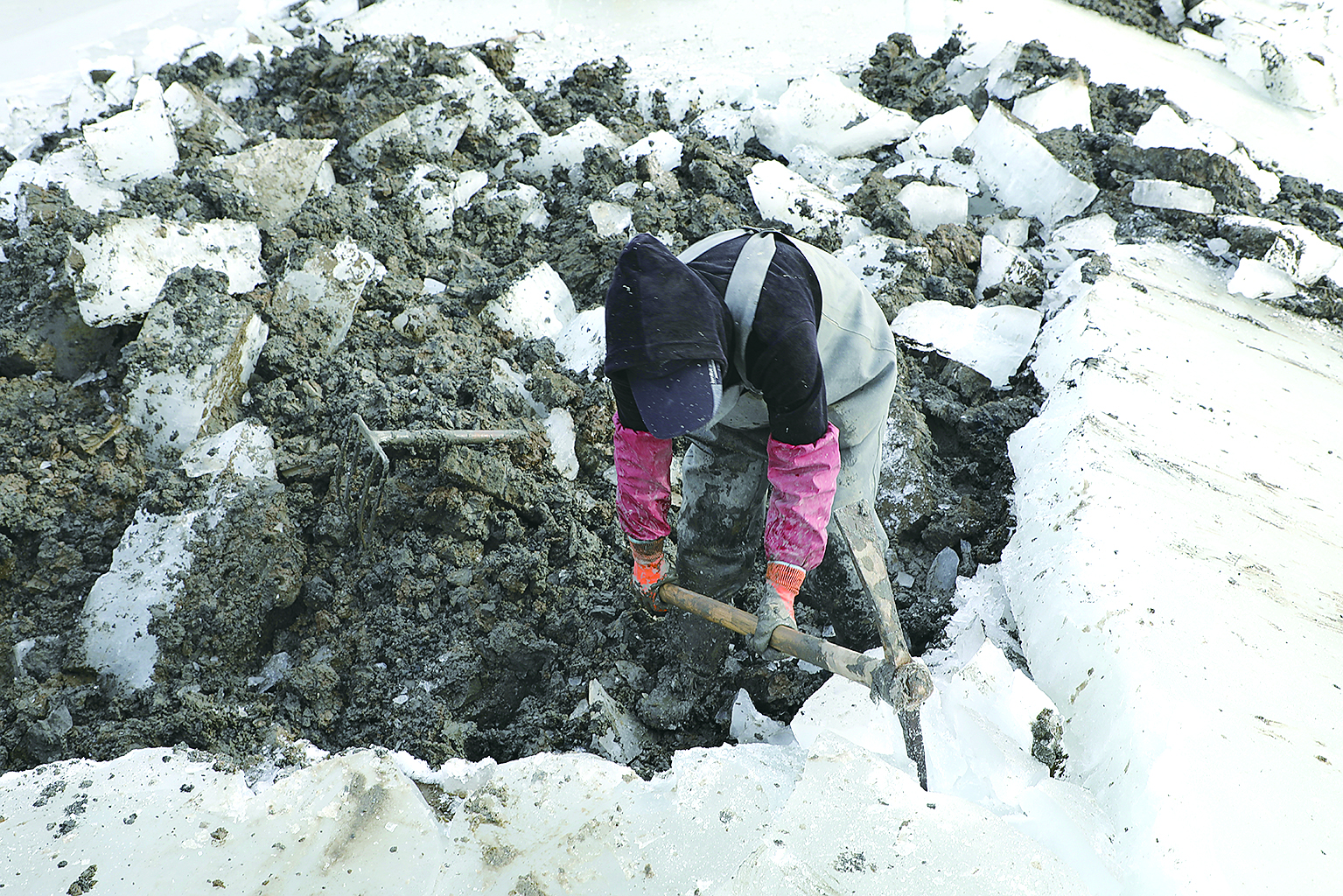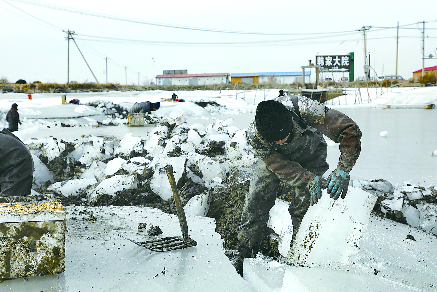 1월 11일 오전 령하 20 ℃의 빙판에서 200여명이 동항 해변의 한 새우양식장에서 얼음을 까고 맛조개를 잡는 작업을 벌이고 있다.편역:추윤