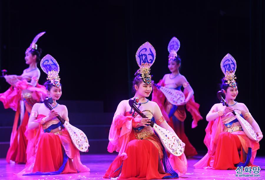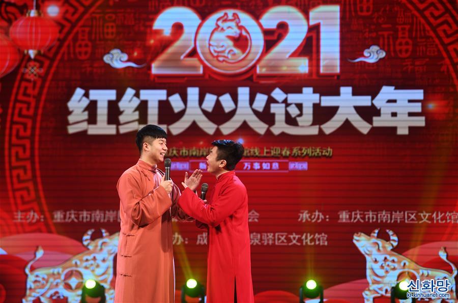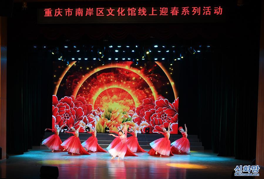 1월26일, 라이브 방송 행사에서 배우들을 춤 공연을 선보이고 있다. 26일 충칭 난안(南岸)구 예술센터 극장에서 무관중 설맞이 문예공연 라이브 방송 행사가 열렸다. 이는 충칭시 난안구 문화관이 주최한 설맞이 온라인 행사 중 하나다. 코로나19 방역 상시화 상황에서 문화행사를 마련해 군중의 정신적 문화 생활을 풍부히 하기 위해 난안구 문화관은 라이브 방송으로 진행하는 무관중 설맞이 문예공연, 풍속, 무형문화유산 종목 소개 등 설맞이 온라인 행사를 기획, 선보여 주민들이 집밖을 나가지 않고도 다채로운 문화 행사에 참여하고 문화를 체험하도록 했다.[촬영/신화사 기자 왕취안차오(王全超)]