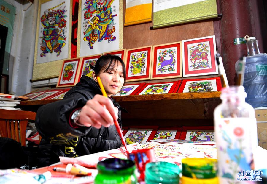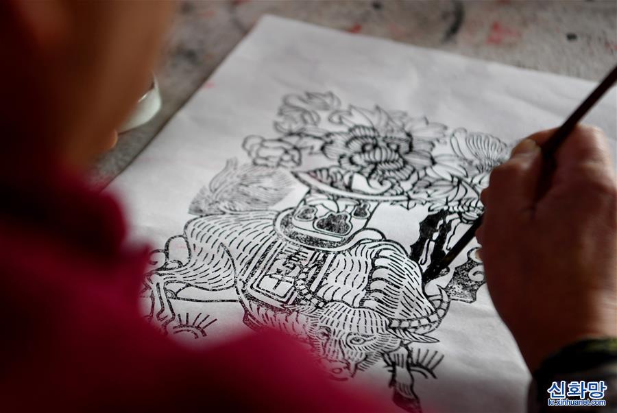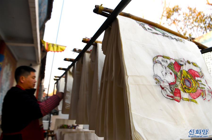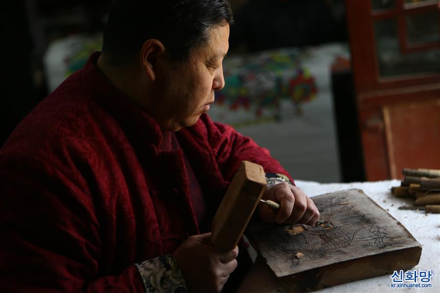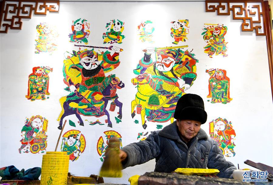 카이펑(開封)시 주셴(朱仙)진의 세화 공예가가 세화를 제작하고 있다. 춘제(春節)가 다가오면서 허난성 카이펑(開封)시 주셴(朱仙)진의 목판 세화 작업장은 설 대목 시장에 공급할 세화 제작에 박차를 가하고 있다. 공정을 중요시하는 주셴진 목판 세화 제작은 모양이 과장되고 선이 호방하며 색채가 화려한 예술적 특징을 지니고 있으며, 2006년 1기 국가급 무형문화유산에 등재되었다. [촬영/신화사 기자 하오위안(郝源)]