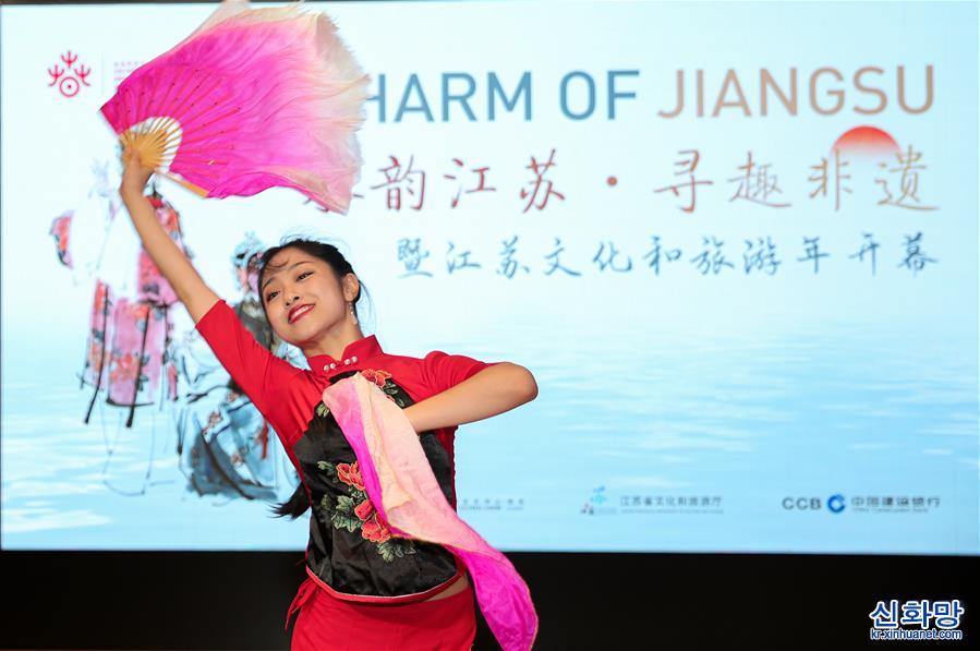 1월27일 호주 시드니 중국문화센터에서 배우들이 ‘수운 장쑤·취미비유(水韵江苏·寻趣非遗),문화상품 전시회 개막식에서 춤을 추고 있다. 중국 춘제에 즈음하여 시드니 중국문화센터와 장쑤성 문화관광청이 공동 주최한 ‘수운 장쑤·취미비유’-장쑤 무형문화재 문화상품 전시회가 시드니 중국문화센터에서 개막했다. 이번 전시회에는 장쑤성 국가급과 성급 무형문화재 백 개 기록 중에 7개의 대표적인 무형문화재를 전시했다. 타오화우(桃花塢)목판세화, 난징운금(南京雲錦), 쑤저우 자수(蘇州刺繡) , 진링(金陵) 종이오림 등은 장쑤성 전통적 수공예품의 아름다움을 집중적으로 보여 줬다. [ 촬영/신화사 기자 백설비(白雪飛)]