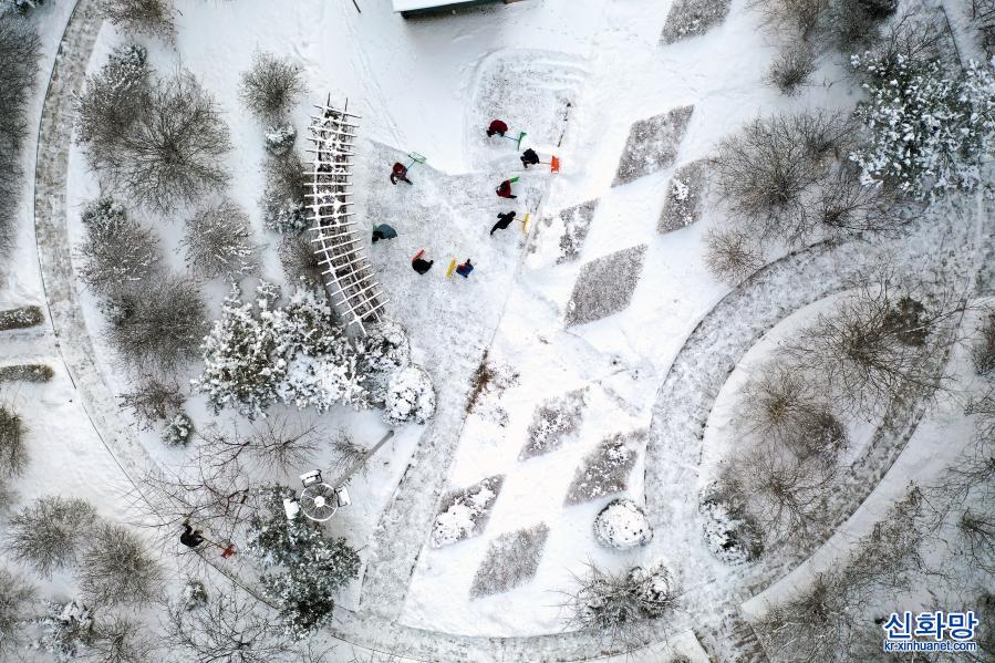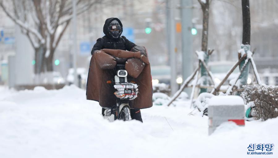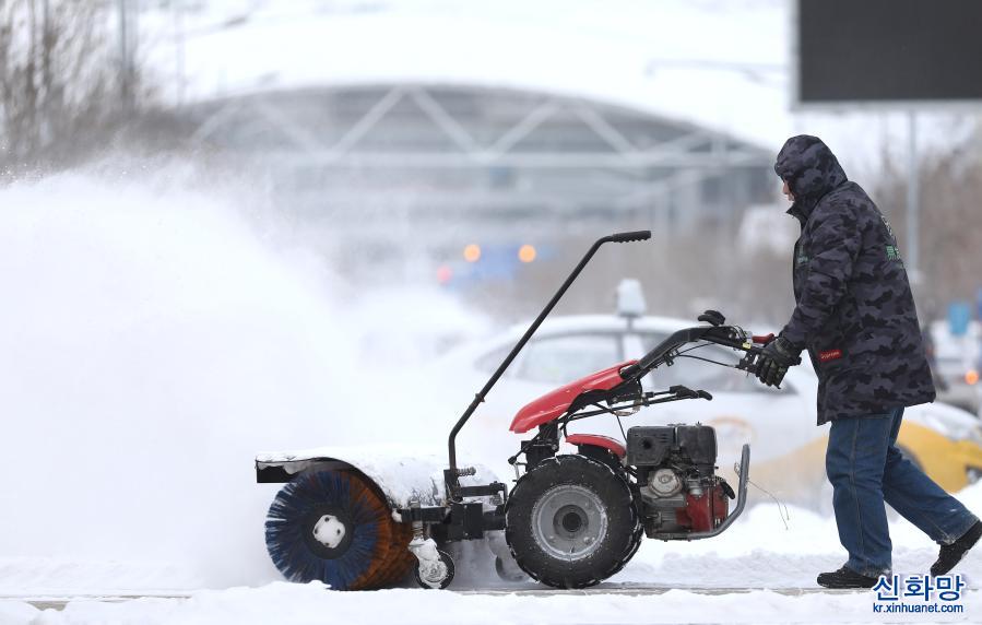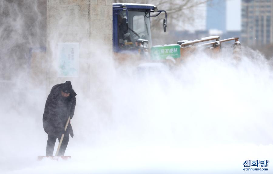 1월28일, 선양(沈陽)시 훈난(渾南)구의 한 주차장에서 직원이 쌓인 눈을 치우고 있다.