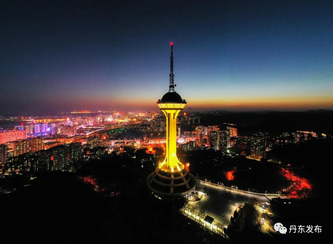 ▲ 2021년 새해를 맞아 밝아지는 원보산의 황해명주탑(黄海明珠塔)은 단동의 새로운 야경이 됐다.