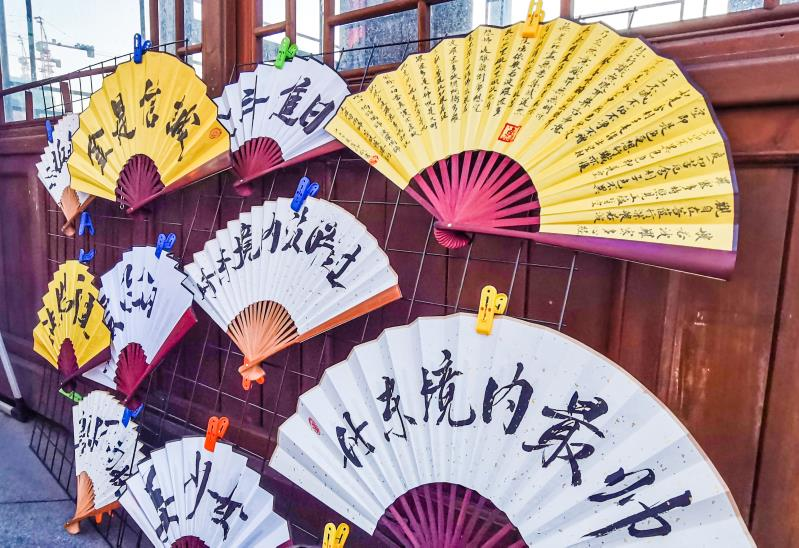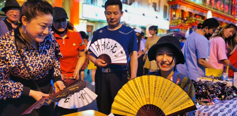 6月16日18时许,记者来到了安东老街门口,此时,已经有许多人将摊位支起,各类吆喝声不绝于耳。“你这个怎么卖?”“写什么都可以吗?”不远处的一个摊位前十几位市民驻足围观,吸引了记者的注意。走到近前,发现一位女孩正在扇面上为顾客题字,蘸墨、落笔,短短几息,“天道酬勤”四字便落于扇面之上。与周遭烟火气息满满的摊位相比,这里流淌的是浓浓的文化味儿。
