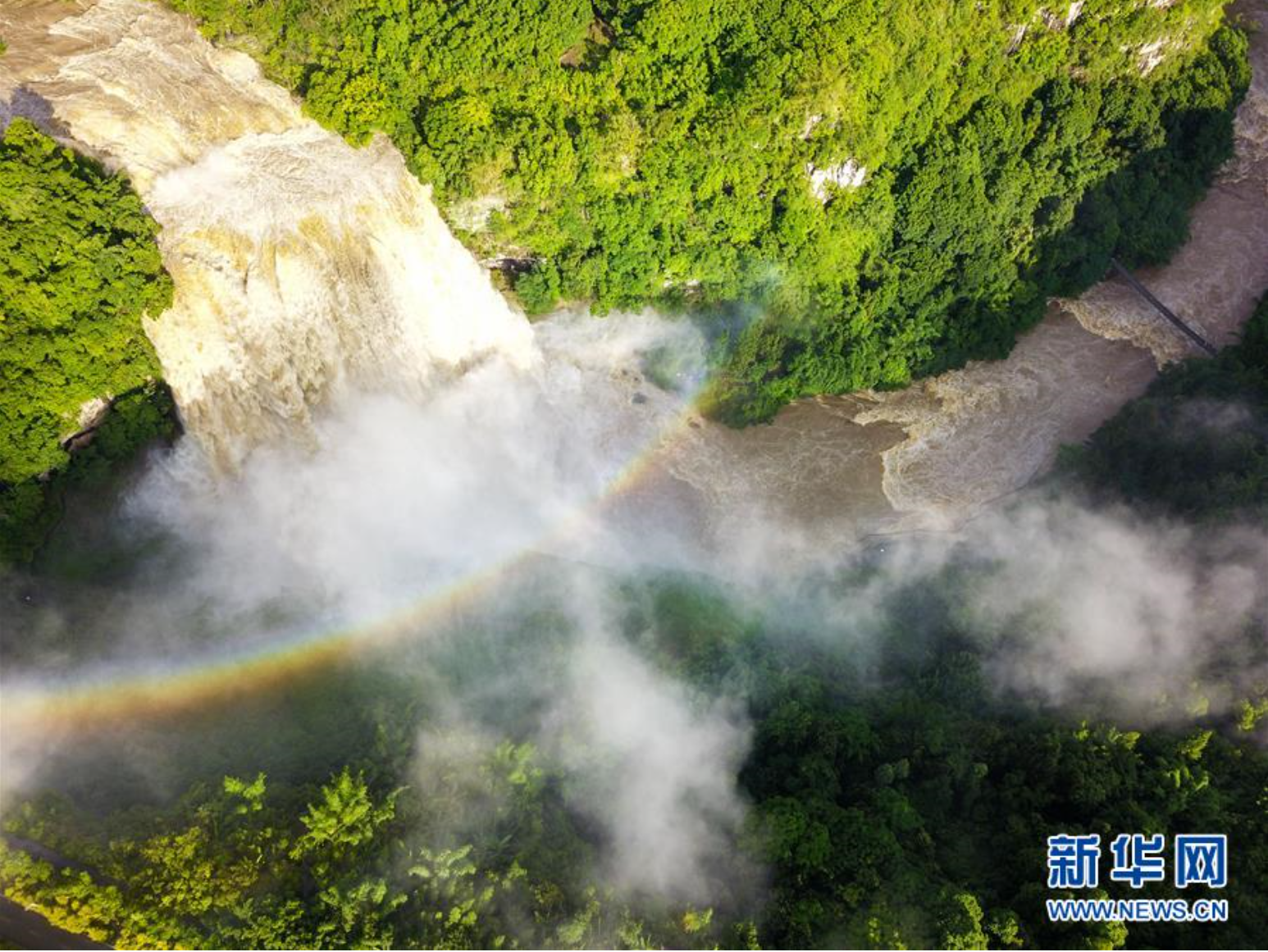 6月14日拍摄的黄果树瀑布(无人机照片)。 当日,受持续降雨影响,贵州黄果树瀑布迎来2020年入汛以来最大水量。据贵州省安顺市水文水资源局实测数据显示,当日黄果树瀑布流量最高时达508立方米/秒。 新华社记者 杨文斌 摄