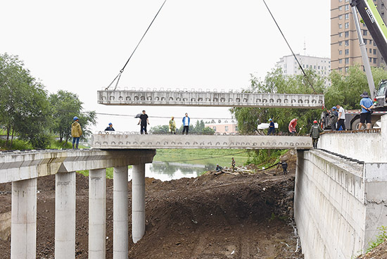 7月6日上午,在福春桥桥梁改造工程现场,市政二公司施工人员冒雨进行桥面铺装。现场工作人员介绍,目前桥梁主体工程即将完工,预计7月中旬实现简易通车。 记者 吴琼 摄