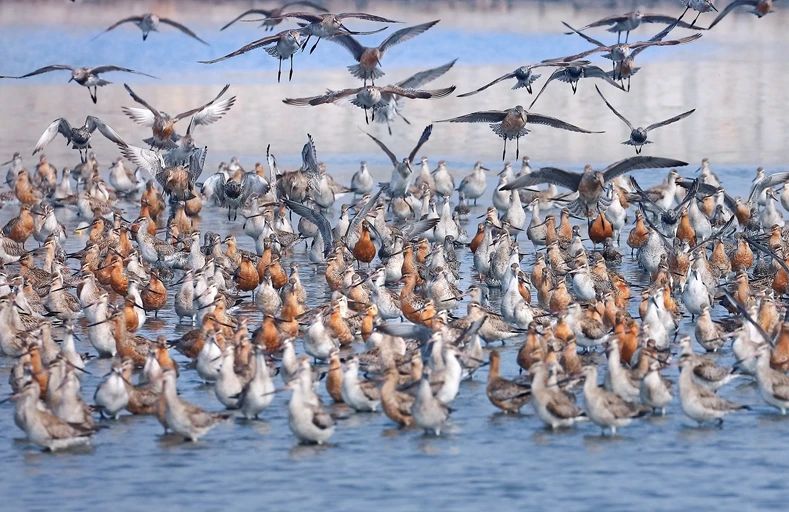 据介绍,每年3至5月,240余种鸻鹬类水鸟会从新西兰、澳大利亚飞行7天1万多公里,到达黄海北岸的鸭绿江口。丹东鸭绿江口湿地国家级自然保护区位于中国海岸线的北端,不仅是候鸟迁徙路线上的重要停留点之一,也是世界著名的鸟类自然保护区和世界级湿地观鸟胜地。绵长的海岸线、丰富的浅水滩涂资源为候鸟万里大迁徙提供了重要补给。据不完全统计,今年飞抵鸭绿江口湿地的候鸟约10余万只,包括斑尾塍鹬、大杓鹬、大滨鹬、黑腹滨鹬等。这些水鸟会在滩涂上觅食休整一个多月,恢复体能,然后北飞至俄罗斯西伯利亚和美国阿拉斯加的繁殖地。