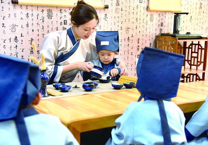 丹东市振兴区把国学经典教育细化、精化、强化、深化,引导中小学生、幼儿园孩子熟悉国学、亲近经典、领悟精髓、感受魅力,用国学教育树品质,让经典文化塑人格,弘扬中华传统文化。图为辖区一幼儿园通过开设经典诵读 、茶艺文化等系列国学特色课程,将经典传统文化传承给孩子,让孩子们在潜移默化的学习中了解国学经典,弘扬中华优秀传统文化。