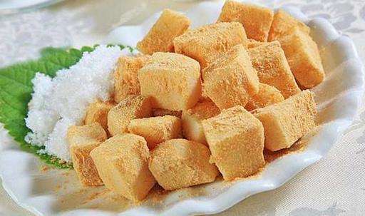 如今,打糕仍是用来招待亲朋好友的首选食品。打糕的原料主要是糯米。不产糯米的地方,则用小黄米或糜子;所洒的豆面原料,除用小红豆外,还可以用黄豆、绿豆、松子、栗子、红枣、芝麻等。