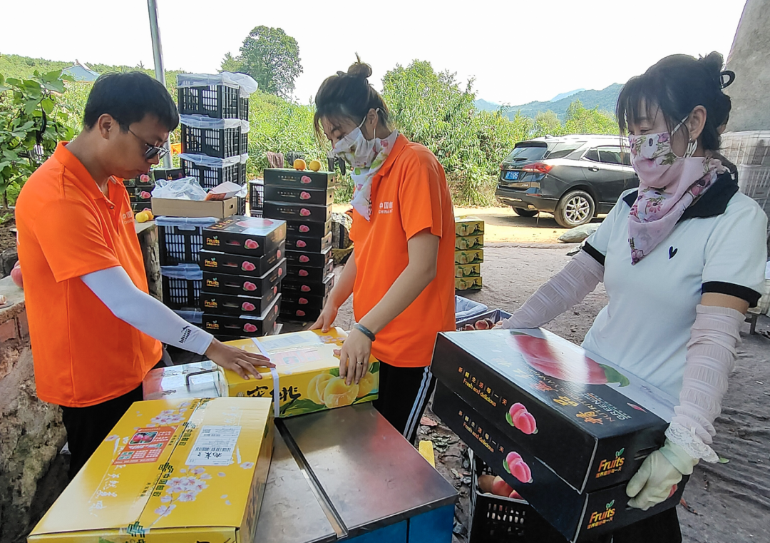 果农们忙着把刚采摘的燕红桃装箱打包