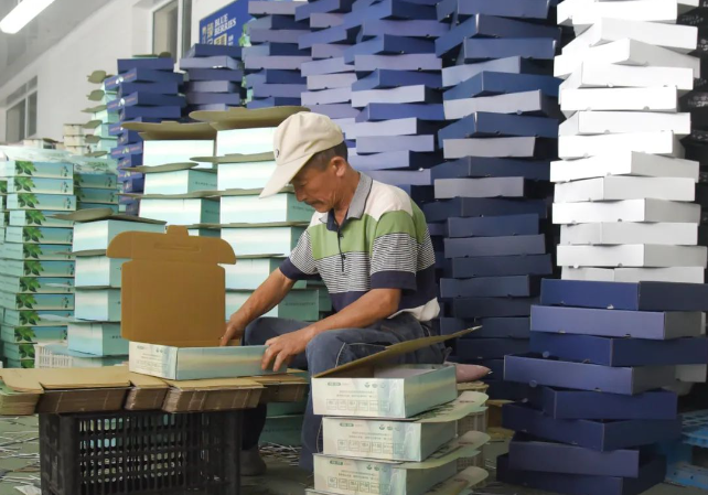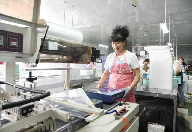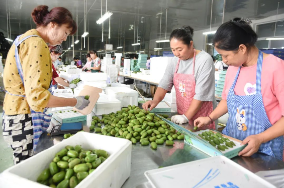 工人们分拣、套袋、装箱