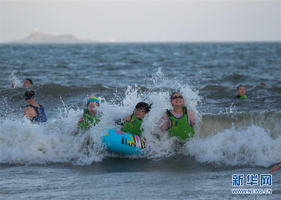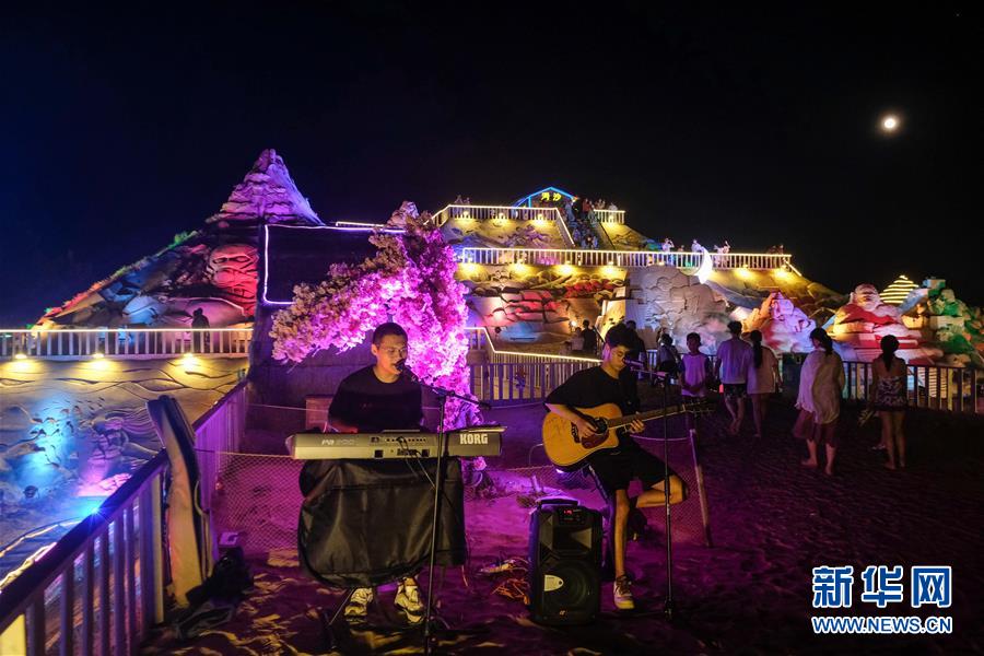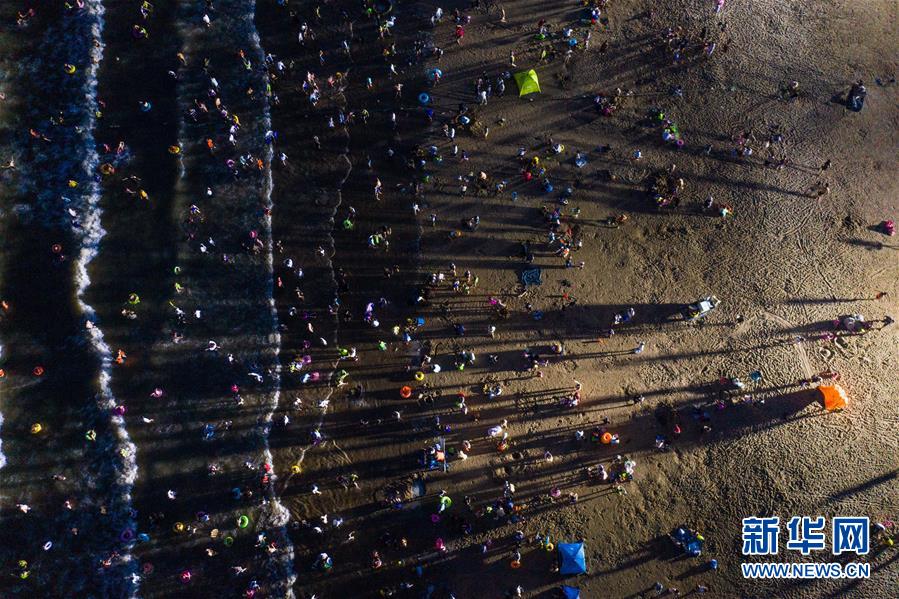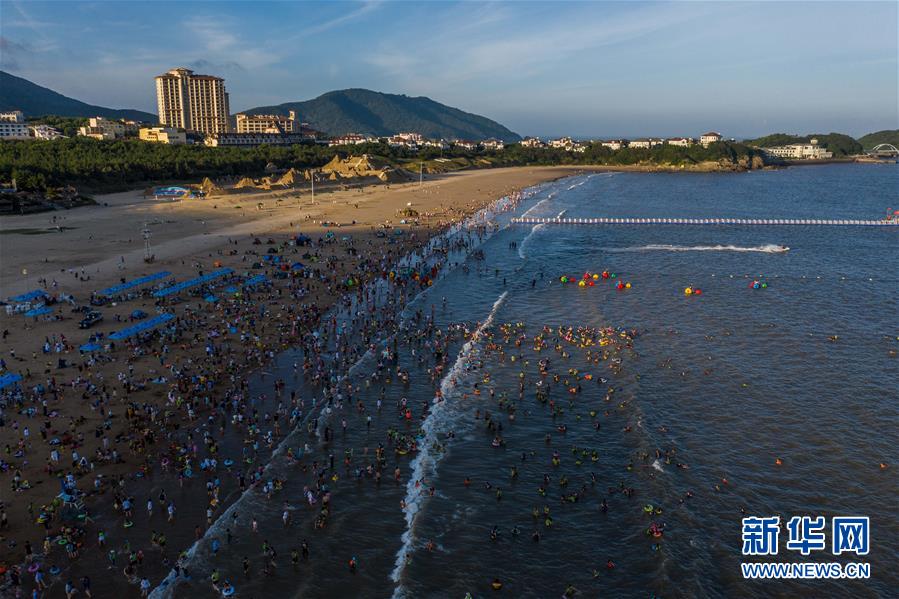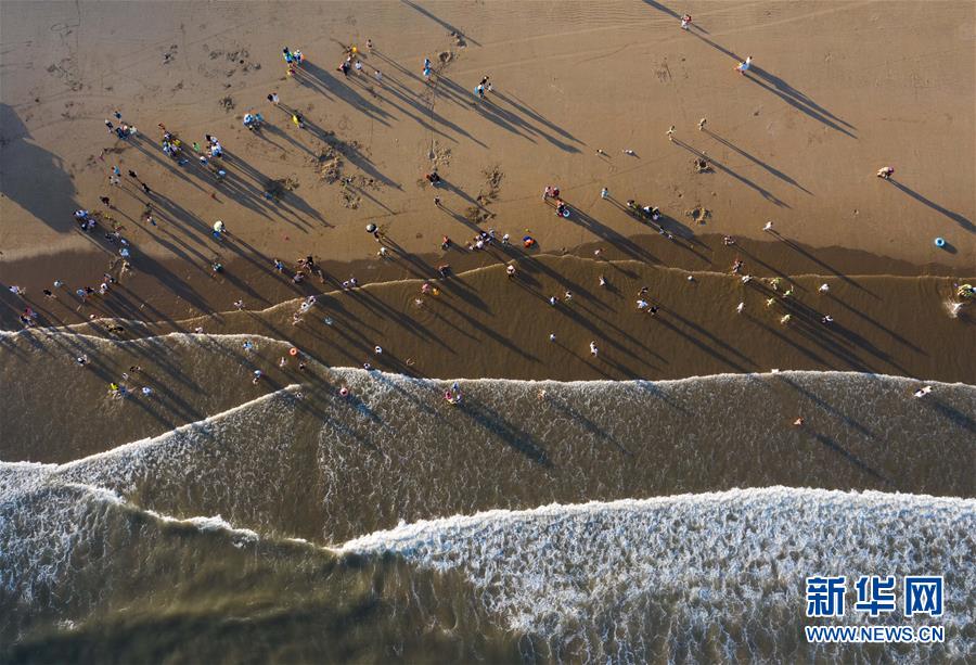 8月2日傍晚,游客在朱家尖南沙景区的沙滩嬉戏游玩(无人机照片)。 近期,地处东海之滨的浙江省舟山市朱家尖景区迎来旅游旺季,游客们纷纷前来感受碧海金沙的夏日风情。从7月份开始,朱家尖南沙景区全面升级沙滩夜游项目,开设了夜泳、夜景沙雕灯光秀、音乐驿站、露天电影、沙雕酒吧等服务,同时健全健康码验码进景区、免费提供救生衣、设立夜泳灯光等安全措施,有效延长了景区开放时间,“沙滩夜经济”成为推动当地旅游业发展的特色品牌之一。 新华社记者 徐昱 摄