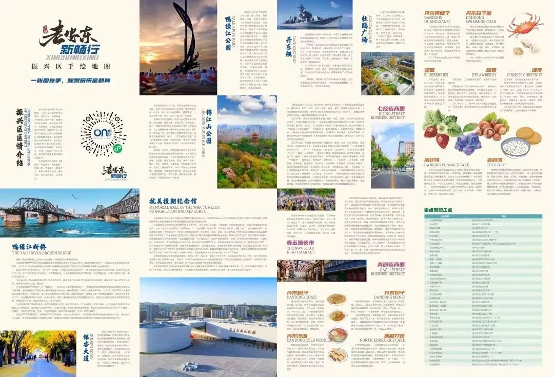 地图正面展示了振兴区知名景点、宾馆、餐厅、大型商超、商圈及重点交通节点,详细绘制了辖区主要街道,游客可据此定位。背面是手绘景点、商圈的图片及文字介绍,让游客深入了解振兴区的人文风情和特产。另外,地图上印有“线上丹东”小程序二维码,扫码后,可进行同城吃喝玩乐购线上支付,提升消费体验。