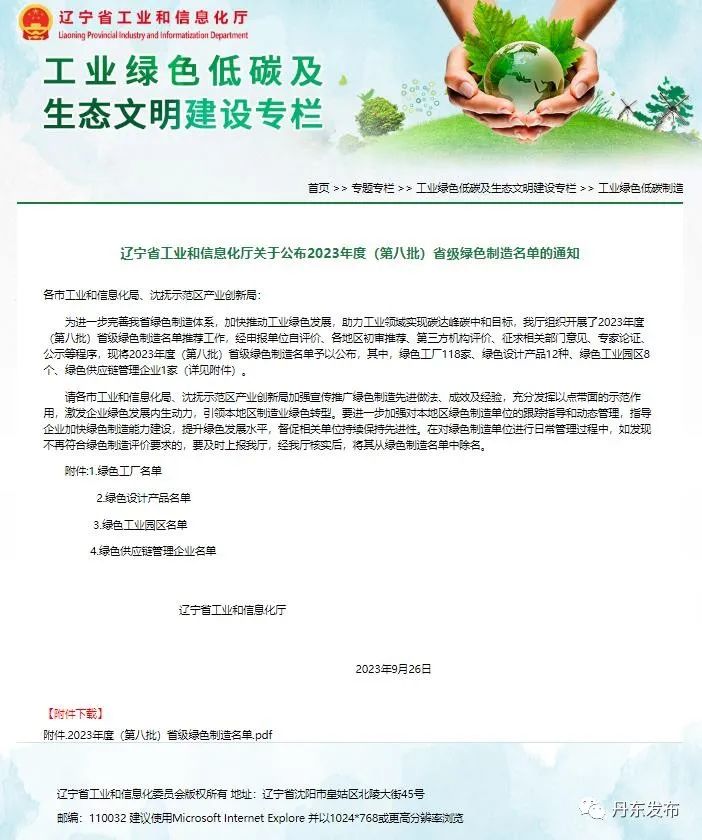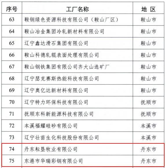 日前,辽宁省工信厅公布了2023年度(第八批)省级绿色制造名单,丹东市耘垦牧业有限公司、东港市华瑞彩钢有限公司两家企业被评为省级绿色工厂。