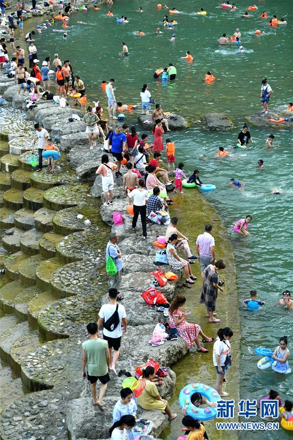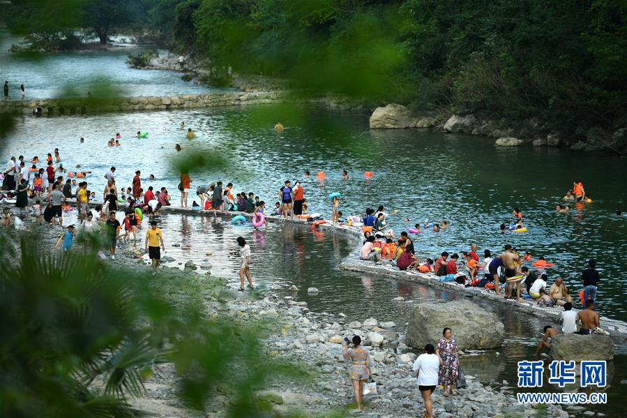 8月5日傍晚,人们在湖北省宣恩县城贡水河游泳区内游泳消暑。 湖北省恩施土家族苗族自治州宣恩县在穿城而过的贡水河两岸设立了亲水步道、游泳戏水、划船健身、休闲纳凉等区域,并建设更衣室、休闲座椅、公共直饮水等基础设施,方便人们共享贡水河带来的夏日清凉。 新华社发(宋文 摄)