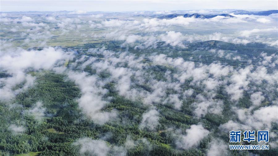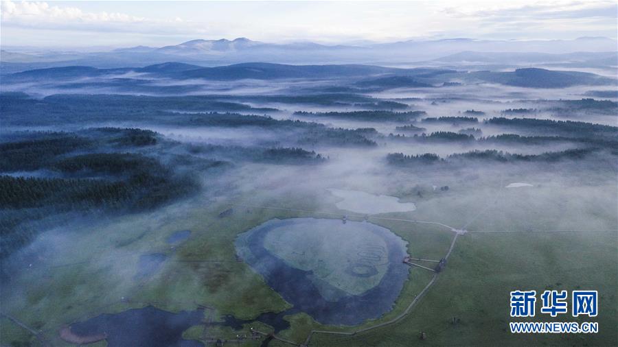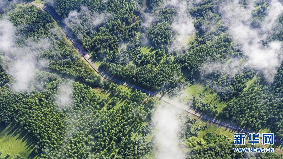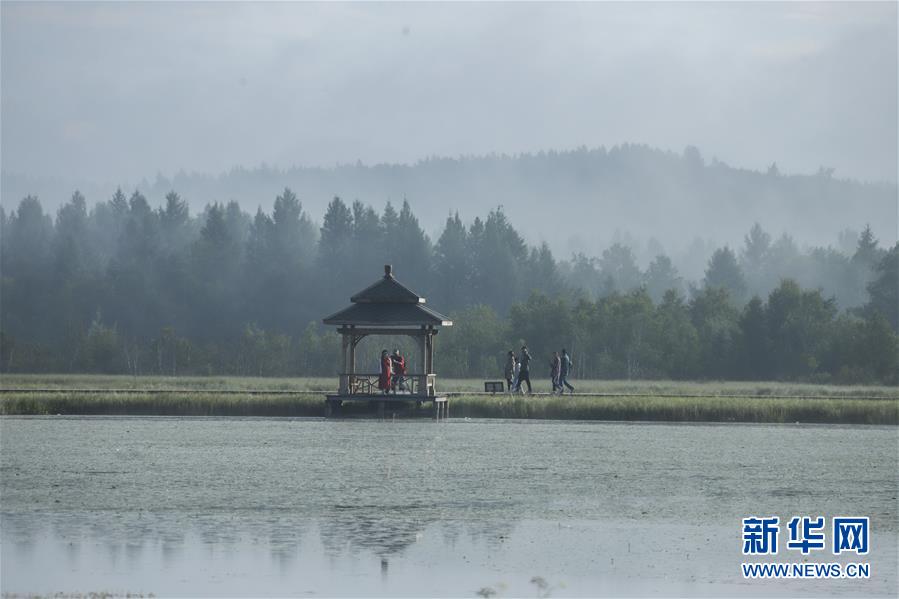 8月9日,游客在塞罕坝国家森林公园游玩。 清晨,位于河北省承德市的塞罕坝国家森林公园云雾缭绕,美景如画。 新华社发(刘满仓 摄)