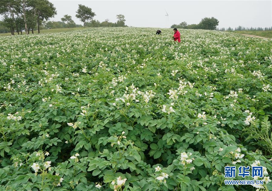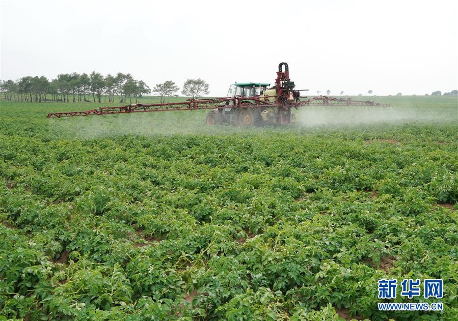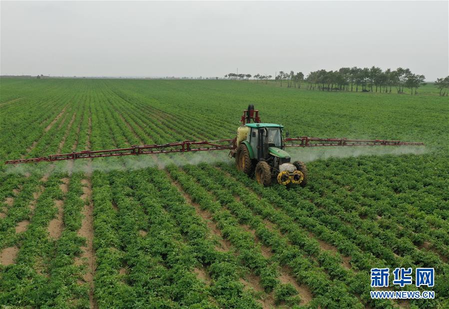 8月12日,在尚义县三工地镇有德元村,农民使用机械设备在田间给旱作马铃薯喷洒农药(无人机照片)。 近年来,地处坝上地区的河北省尚义县大力实施地下水超采综合治理,积极探索旱作雨养种植技术,发展马铃薯、莜麦和油葵等旱地农作物,促进生态环境恢复。据介绍,该县2019年以来,先后关停灌溉用井1200余眼,旱地改草23万亩,水浇地改旱地11万亩。 新华社记者 杨世尧 摄