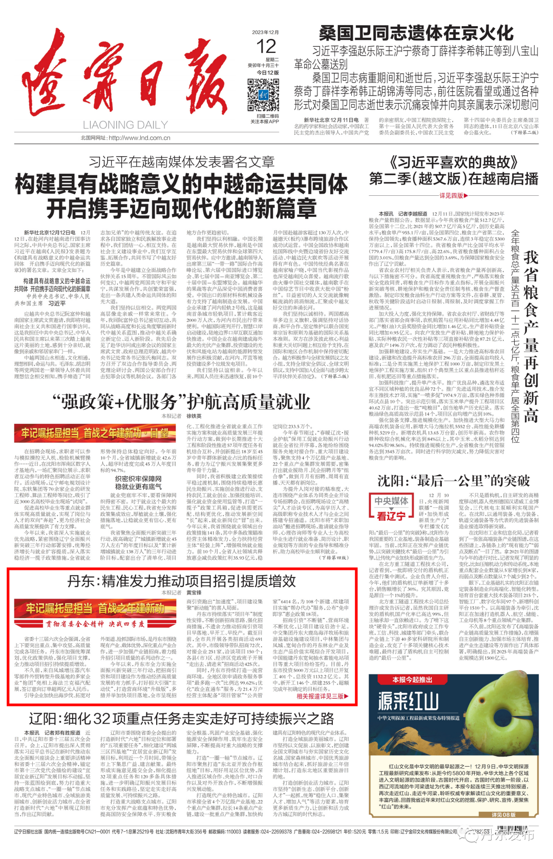 12月12日出版的《辽宁日报》,在头版和三版分别以《丹东:精准发力推动项目招引提质增效》《丹东市掀起项目建设热潮——冬日施工不“打烊” 冲刺收官建设忙》为题,报道了丹东市加强统筹谋划,优化政策供给,强化项目支撑,全力推动项目招引持续提质增效。