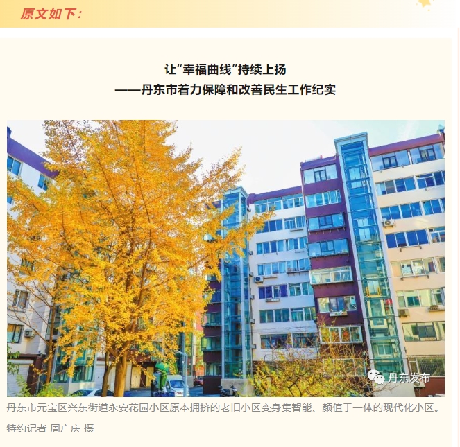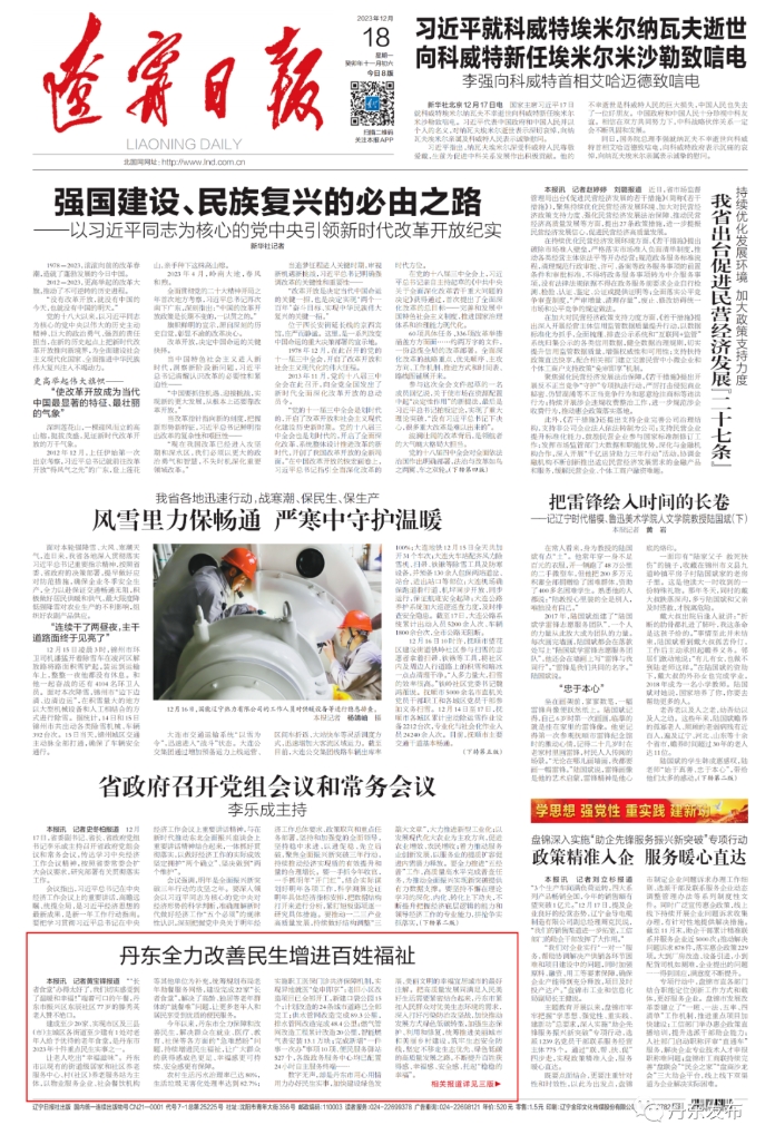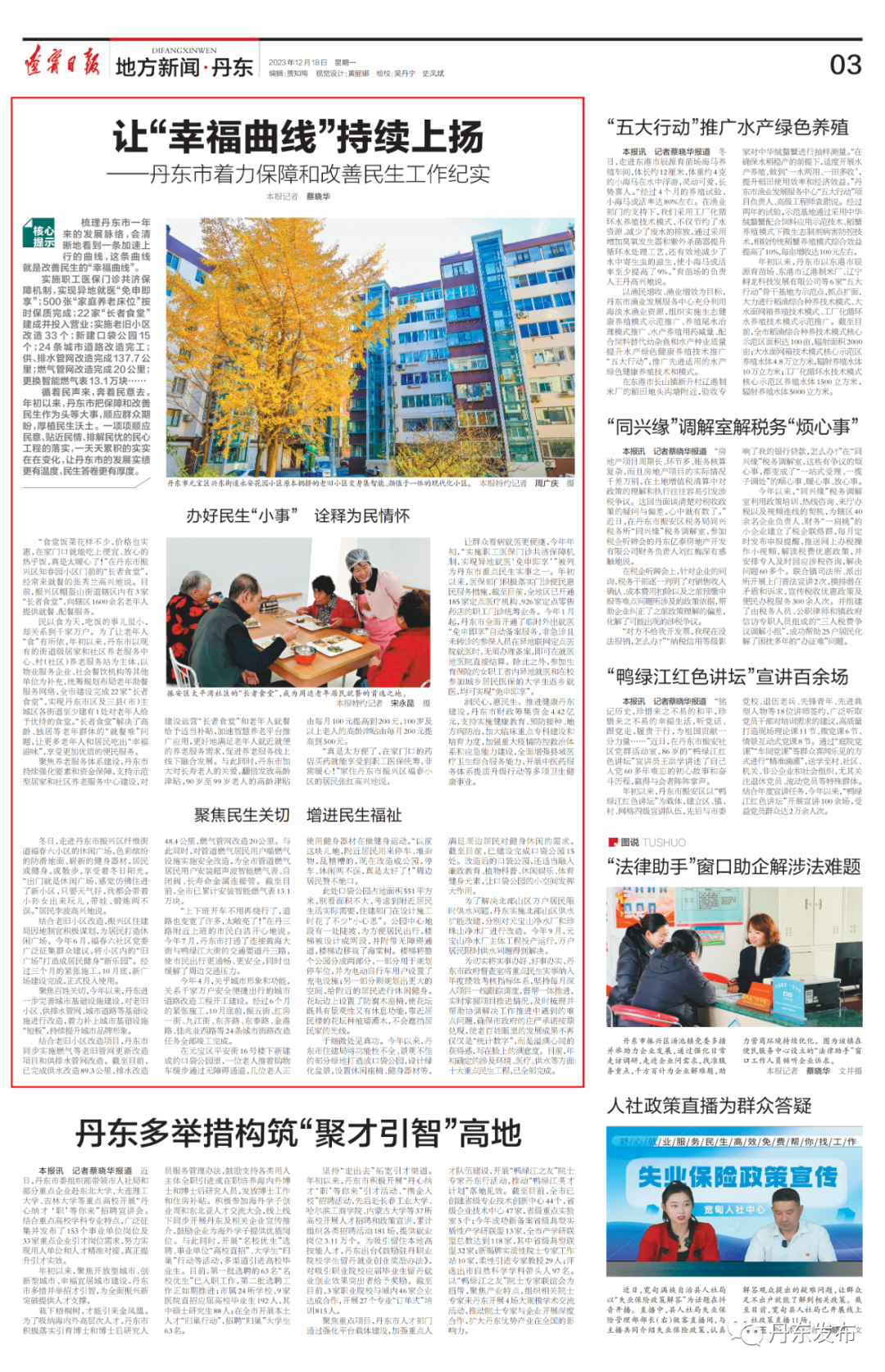 12月18日,辽宁日报在头版和三版分别以《丹东全力改善民生增进百姓福祉》《让“幸福曲线”持续上扬——丹东市着力保障和改善民生工作纪实》为题,对丹东用心用情用力办好民生实事,加快建设绿色发展、美丽文明的幸福宜居城市进行了报道。