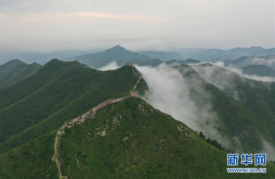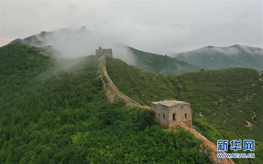 8月18日拍摄的河北省迁安市杨各庄镇徐流口村段的长城景色(无人机照片)。 当日,一场降雨过后,迁安市徐流口村段的长城云雾缭绕,景色如画。 新华社记者 李继伟 摄