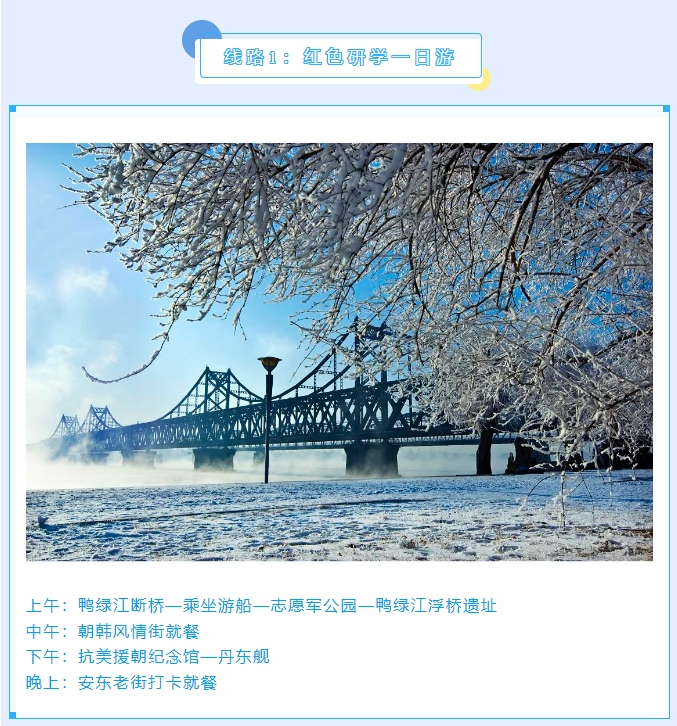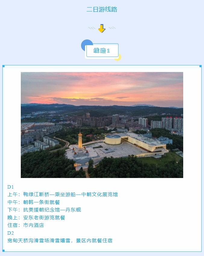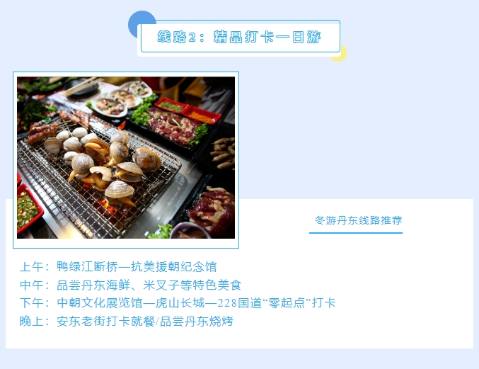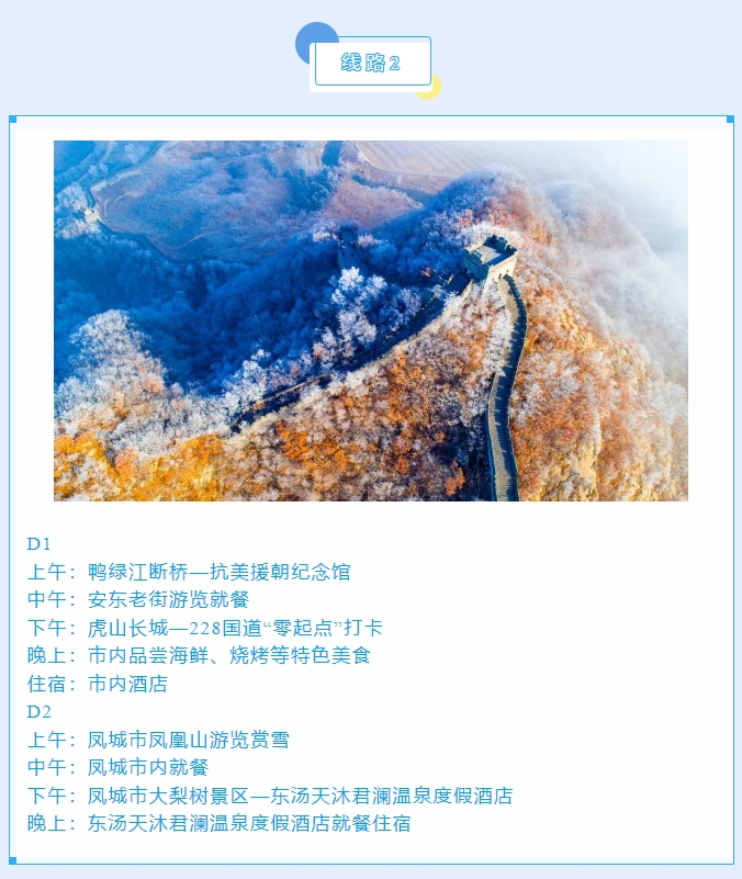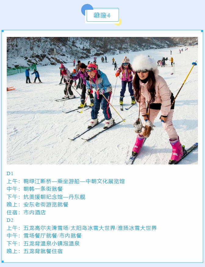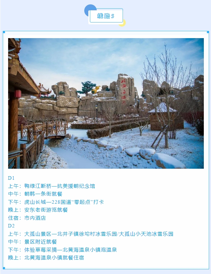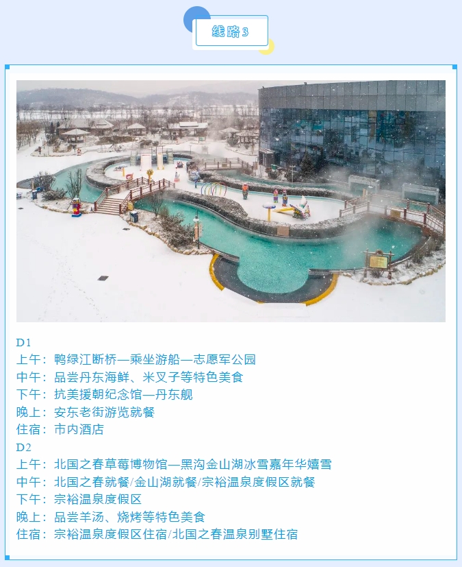 丹东是中国最大最美的边境城市,更是一座因抗美援朝战争而享誉海内外的“英雄城市”。丹东四季皆美,冬韵更浓,是整个大东北冬季最宜居、最温暖、最湿润的城市,既有“北国风光、千里冰封、万里雪飘”的壮美,又有对游客朋友极其友好的冬日暖阳,还有热气氤氲、洗去一身疲惫的特色温泉。小编在此奉上冬游丹东精品线路,邀请大家来丹东嬉冰雪,泡温泉,游边境,品美食,过大年!