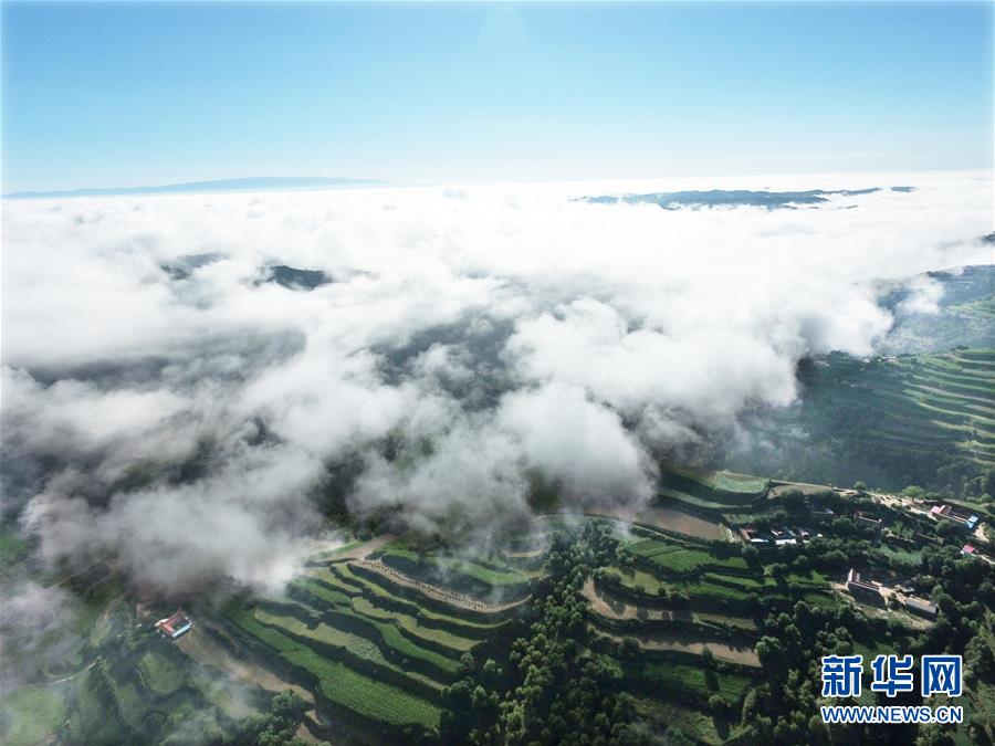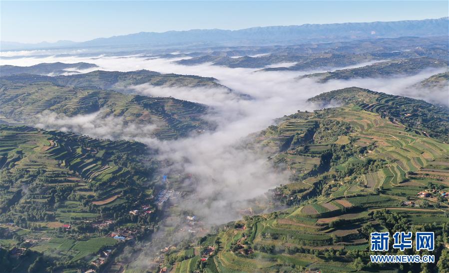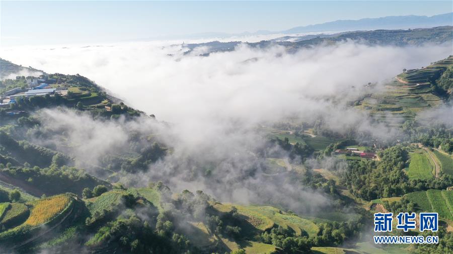 这是8月24日拍摄的甘肃省临夏回族自治州东乡族自治县山区梯田景观(无人机照片)。 一场降雨过后,甘肃东乡族自治县的山乡梯田云雾缭绕,风景如画。 新华社发(史有东 摄)