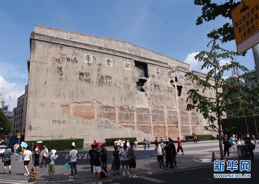 8月25日拍摄的上海四行仓库西墙,如今这里也是四行仓库抗战纪念馆向公众展示的重要组成部分。 近日,在四行仓库保卫战原址上设立的上海四行仓库抗战纪念馆成为热门参观点。 新华社记者 任珑 摄