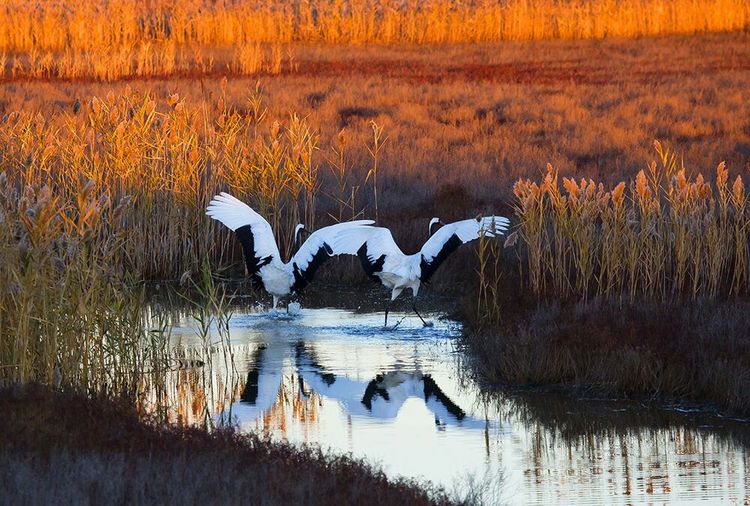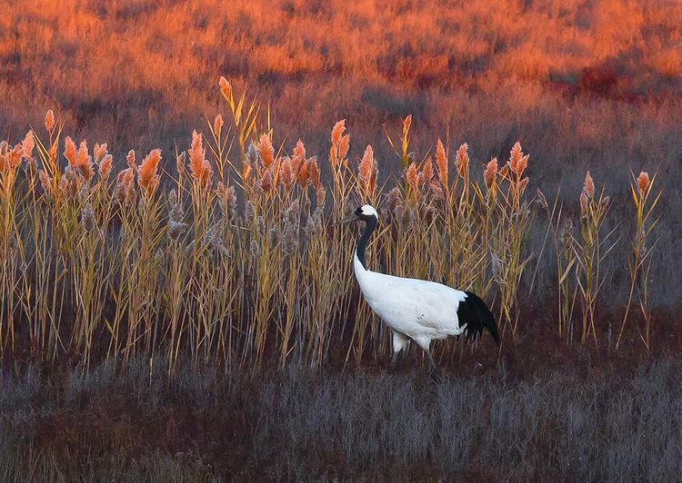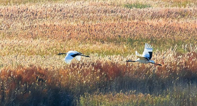 辽宁省盘锦市拥有大面积的滨海芦苇沼泽区,是世界生态系统保存最完整的湿地之一。这里也是丹顶鹤迁徙通道中的一个重要停歇地。