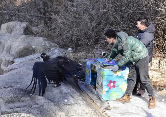 10时30分许,野保工作人员和志愿者在元宝山公园成功放飞一只被救助的成年秃鹫。
