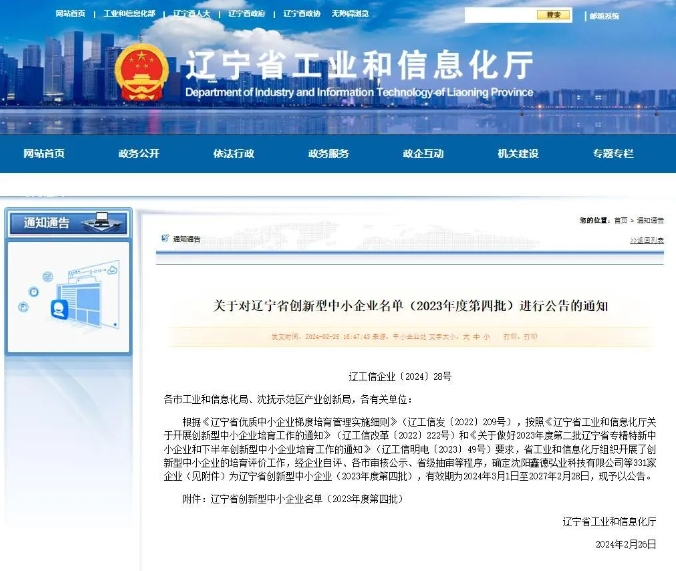 日前,辽宁省工业和信息化厅下发通知:根据《辽宁省优质中小企业梯度培育管理实施细则》,按照《辽宁省工业和信息化厅关于开展创新型中小企业培育工作的通知》和《关于做好2023年度第二批辽宁省专精特新中小企业和下半年创新型中小企业培育工作的通知》要求,省工业和信息化厅组织开展了创新型中小企业的培育评价工作,经企业自评、各市审核公示、省级抽审等程序,确定沈阳鑫德弘业科技有限公司等331家企业(见附件)为辽宁省创新型中小企业(2023年度第四批),有效期为2024年3月1日至2027年2月28日,现予以公告。